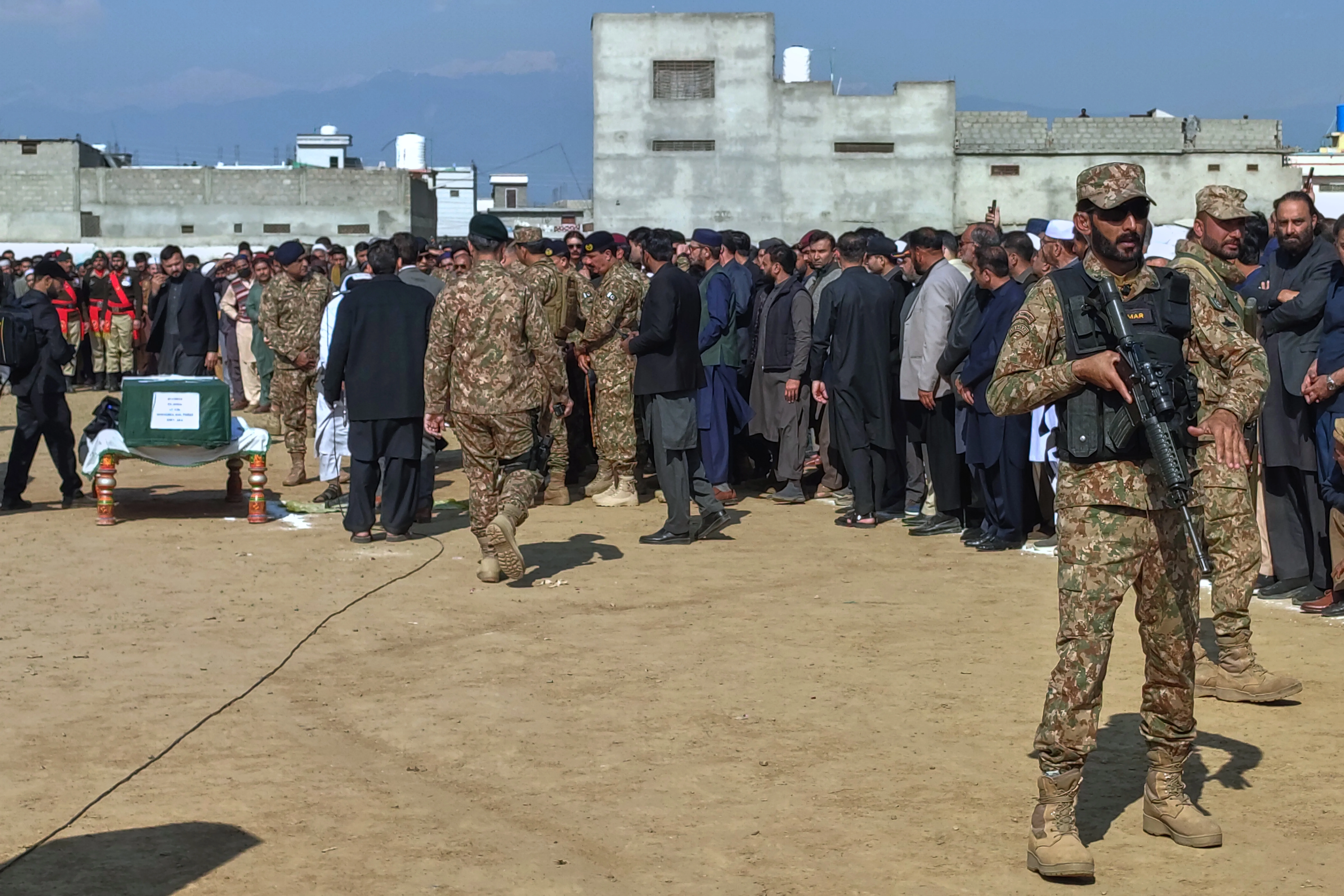 Солдат стоит на страже, пока армейские чиновники и другие присутствуют на похоронной молитве по офицеру, погибшему в результате теракта смертника в приграничном районе Банну, в Мансехре. Пакистан, 22 февраля 2026 года