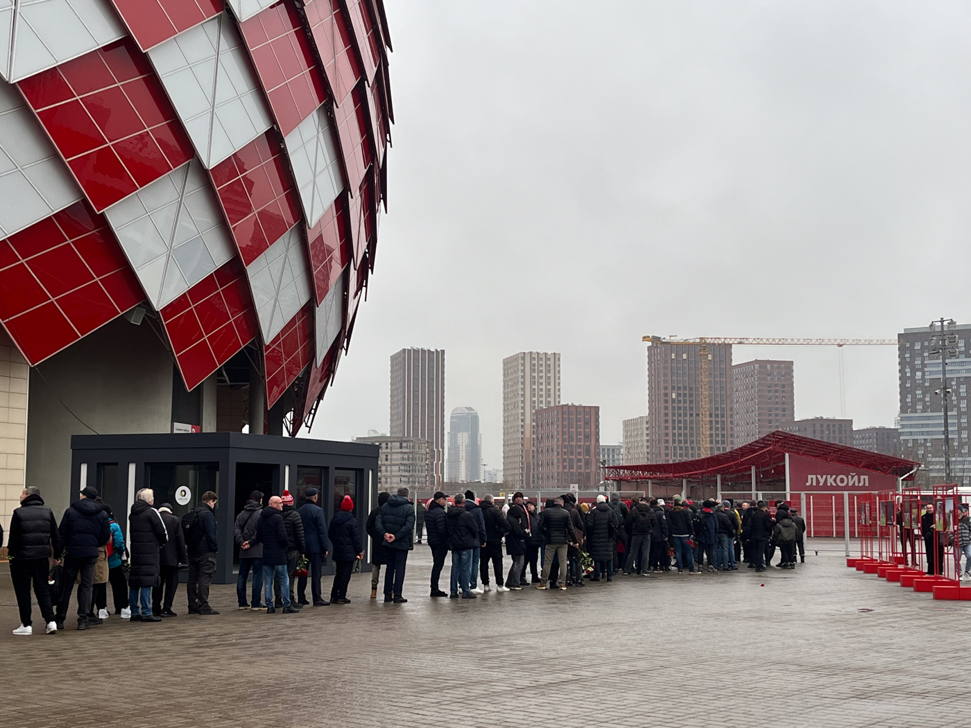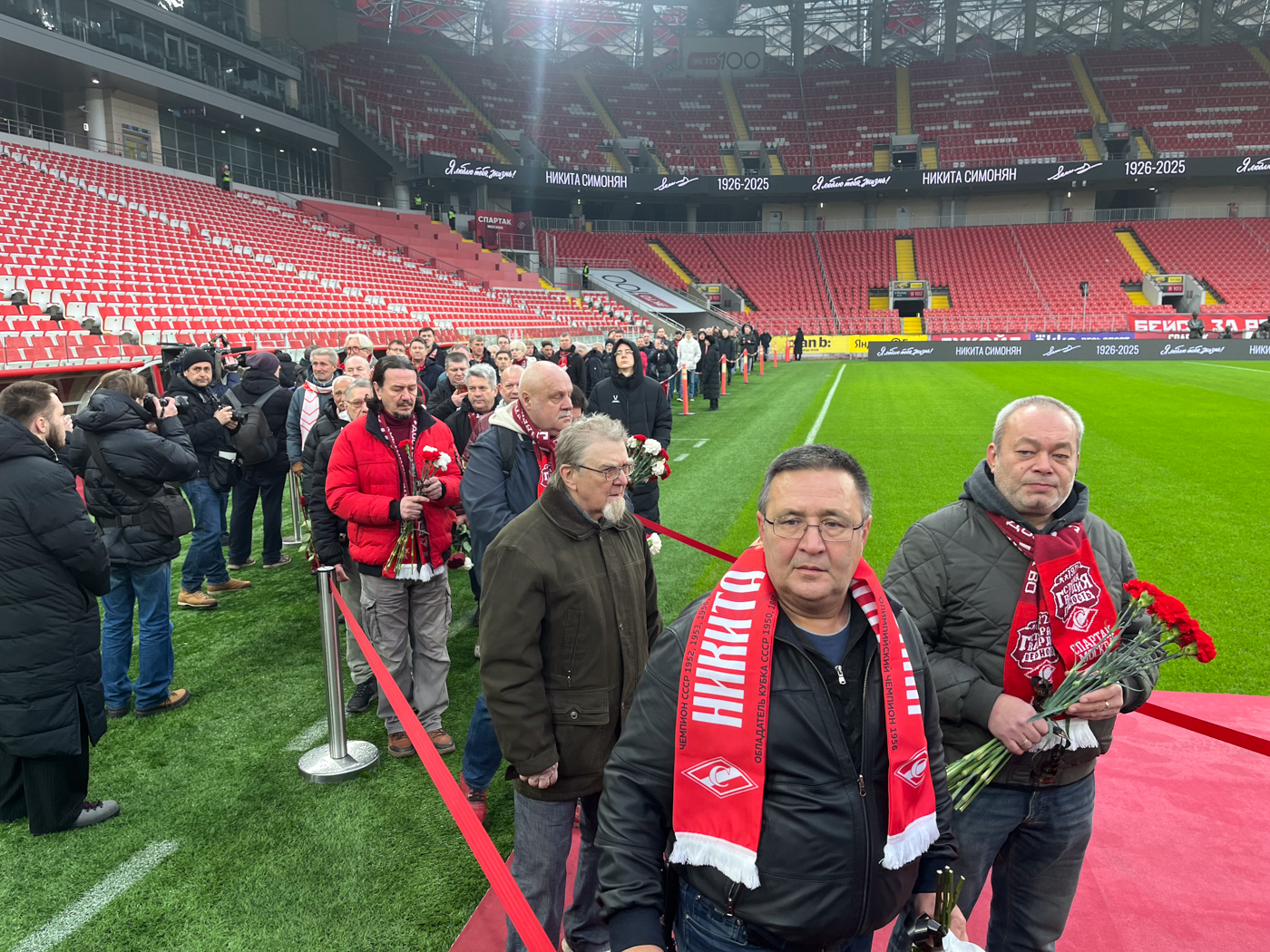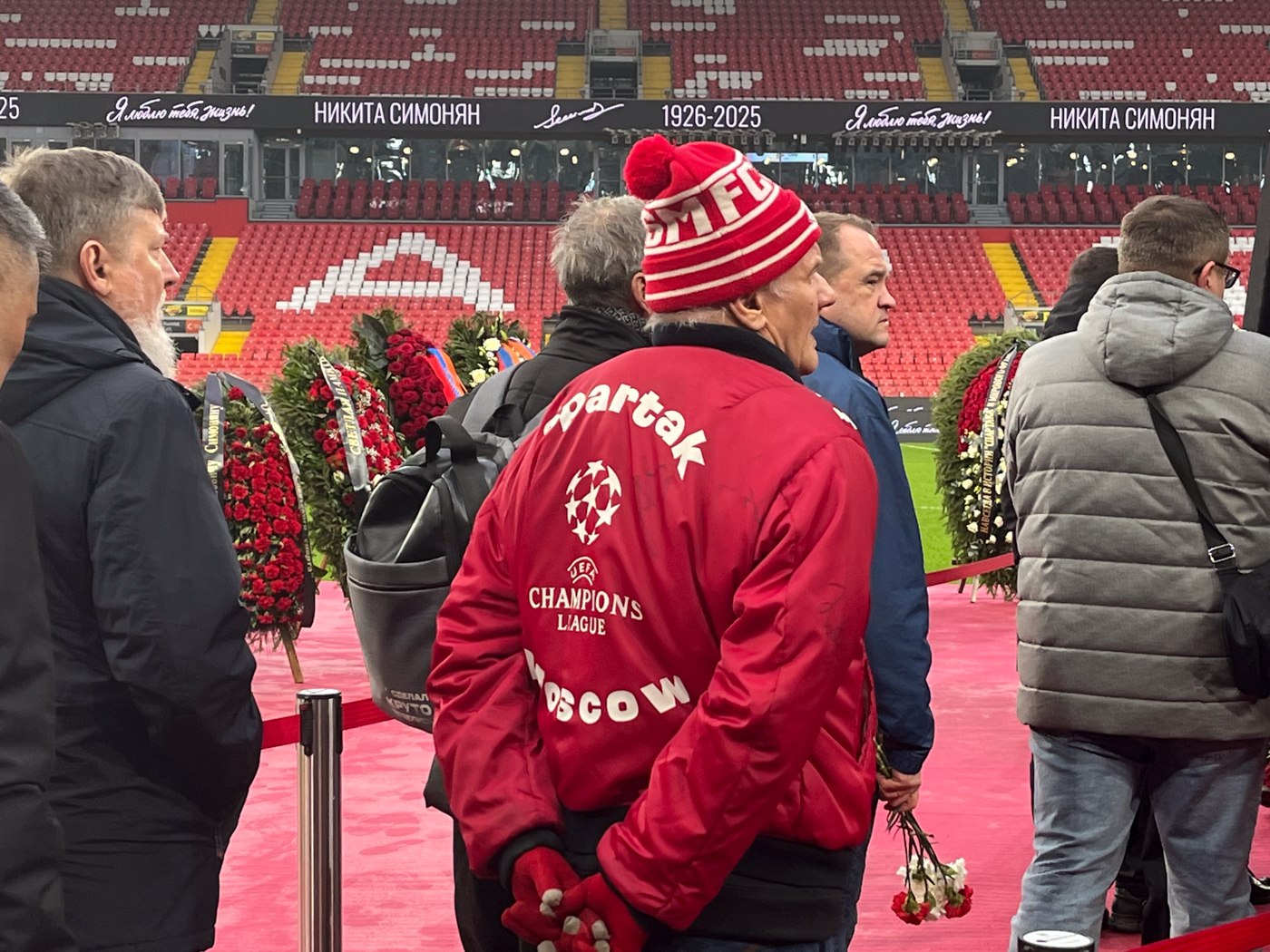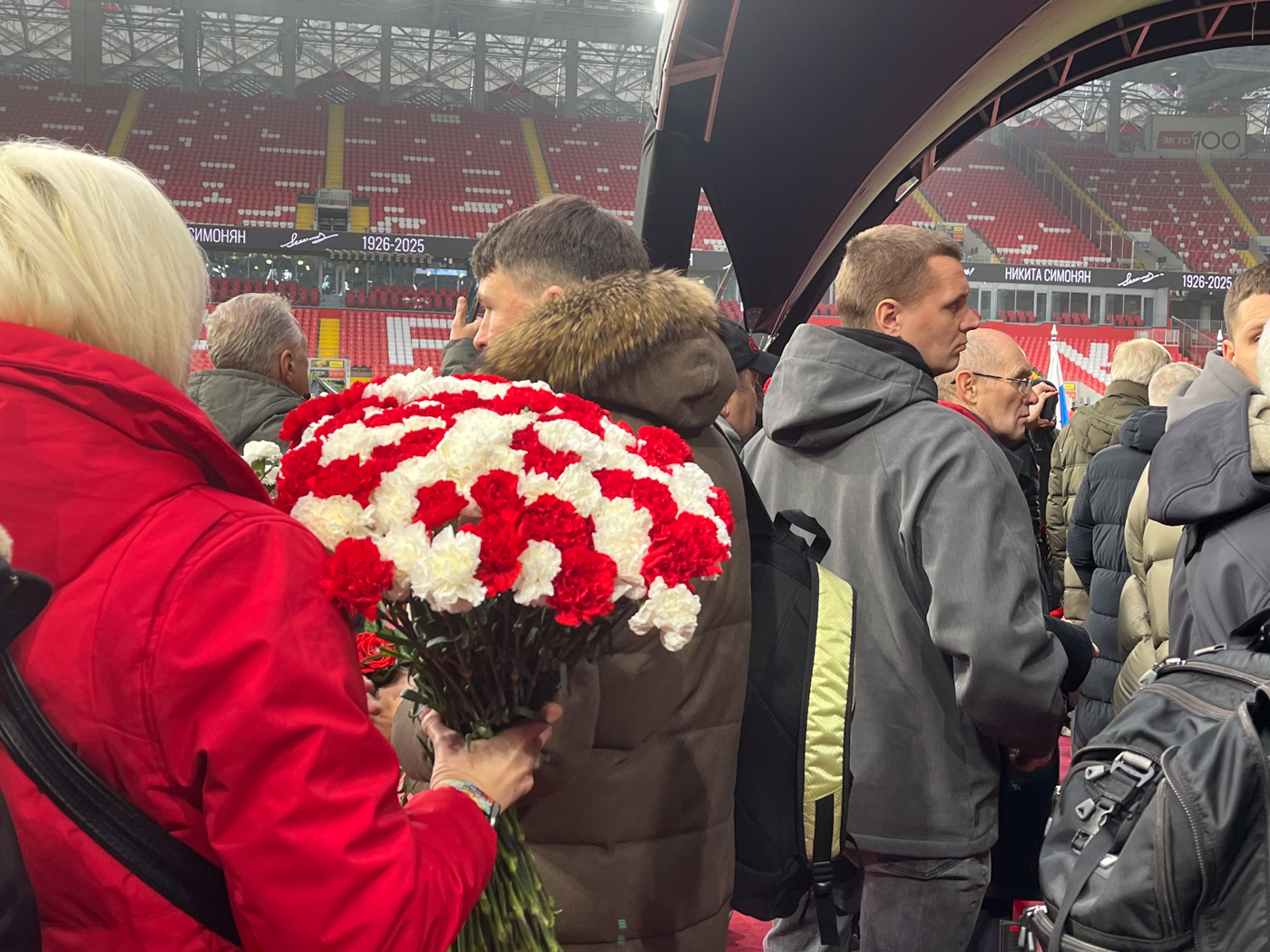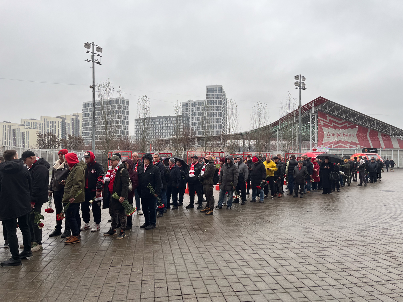 Несмотря на буднее утро, промозглую погоду и серое небо, у входа на стадион начинает стягиваться вереница из людей в красно-белых шарфах и с гвоздиками — красными и белыми. Эти цвета издавна закрепились за московским «Спартаком».
