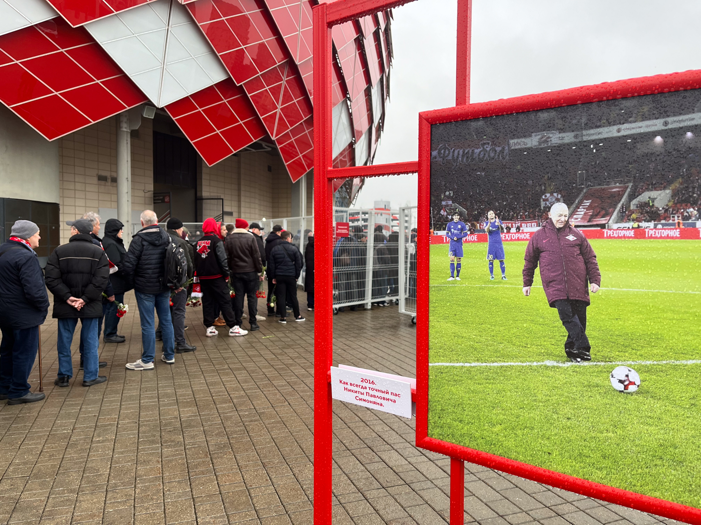 Пришедшие на траурное мероприятие стоят возле выставки работ фотографа «Спартака» Александра Ступникова, скоропостижно умершего в этом году на 41-м году жизни. На одном из его кадров Симонян отдает символический пас перед началом игры. «2016. Как всегда точный пас Никиты Павловича Симоняна», — гласит подпись к фото.
