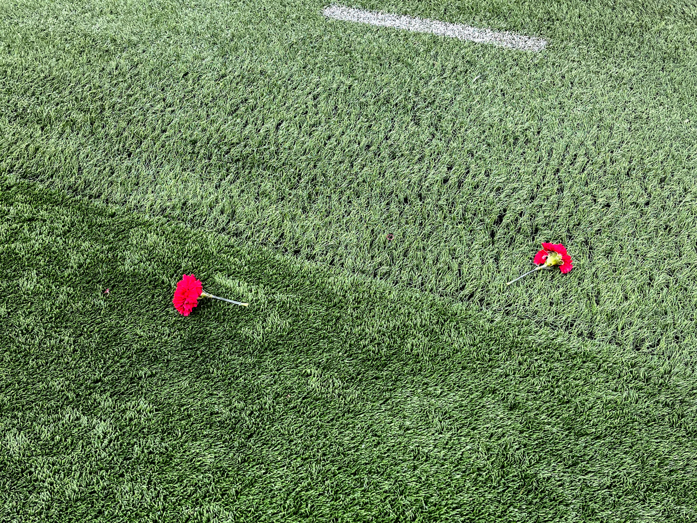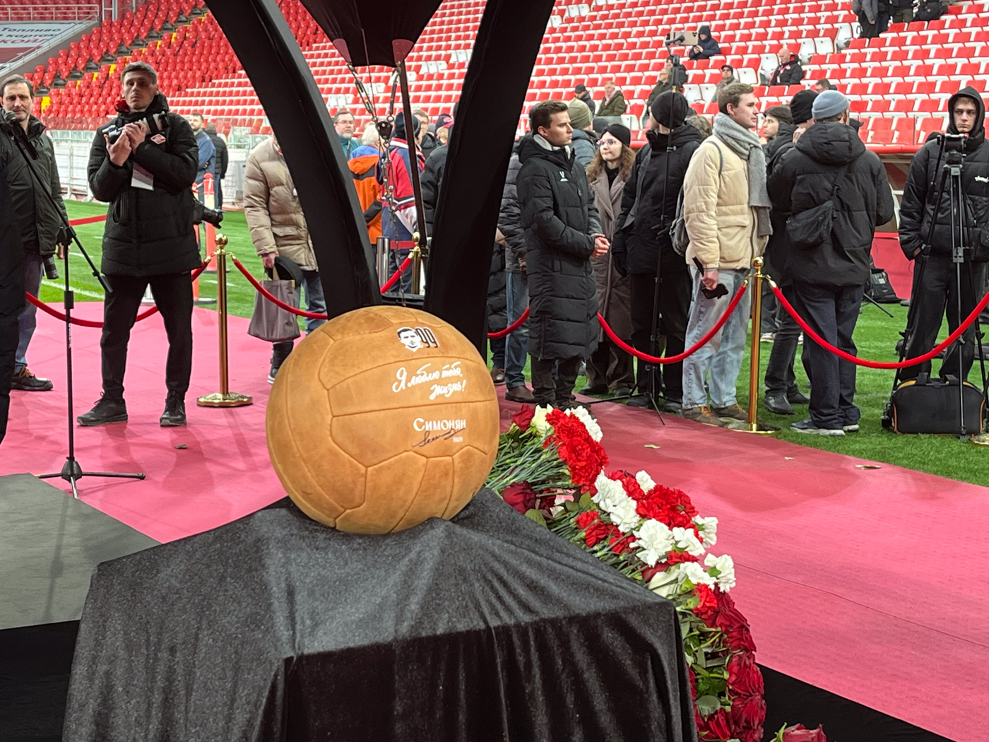 Захожу на стадион. Под его сводами звучат комментарии советских дикторов: «Товарищ Симонян, удар, мяч в сетке ворот». На огромных экранах идет видеонарезка событий из богатой на них жизни Никиты Симоняна. На футбольном поле лежат не мячи, а гвоздики.