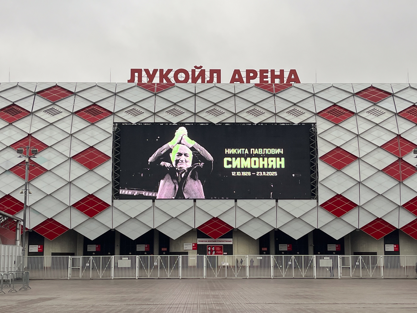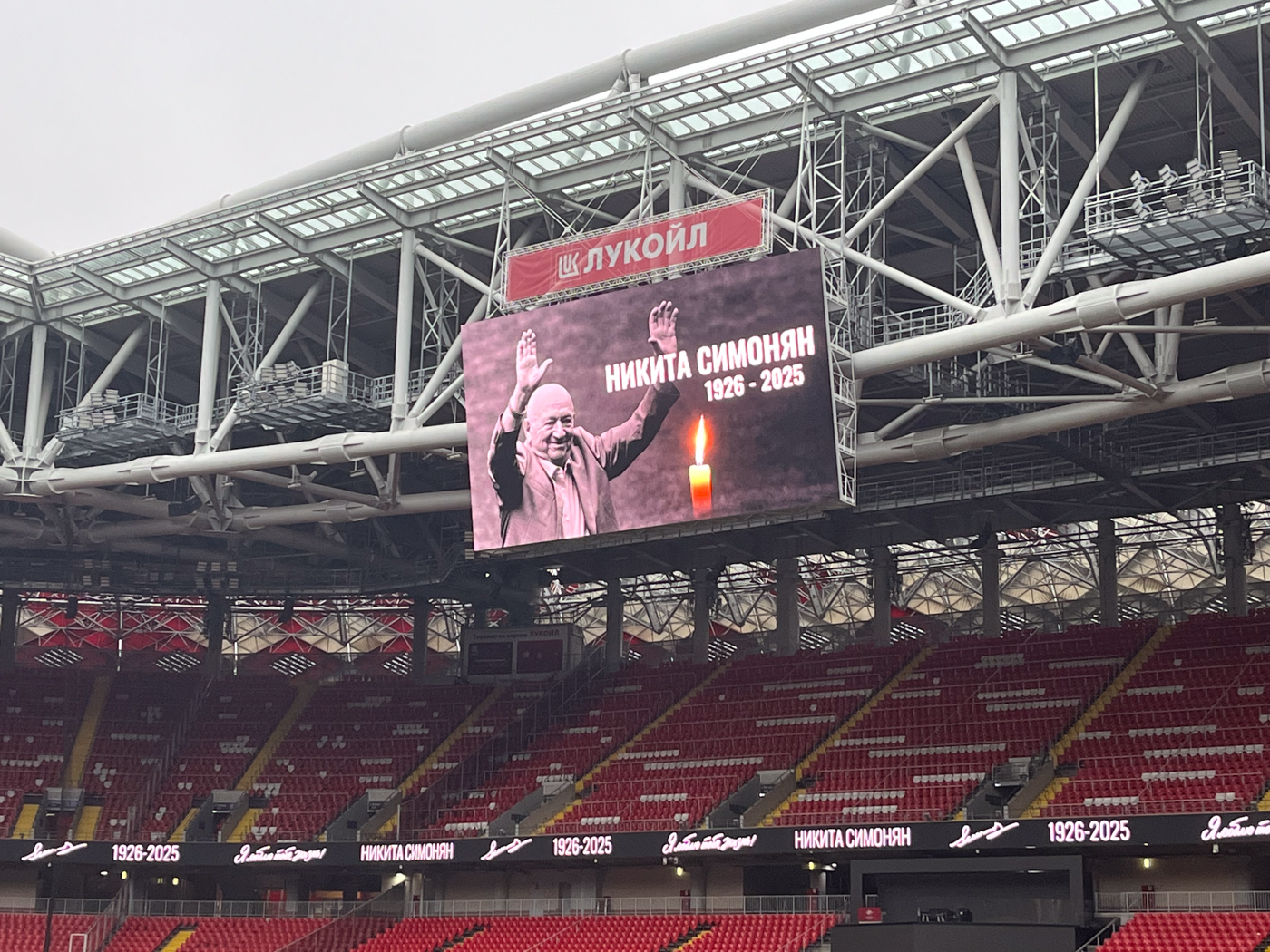 Вдоль всей арены повторяется надпись: «Я люблю тебя, жизнь!» Эту песню советской эстрады Лев Лещенко (к слову, болельщик «Динамо») совсем недавно исполнил перед товарищеской игрой сборных России и Боливии в честь дня рождения Никиты Симоняна. 12 октября великому спартаковцу исполнилось 99 лет. До своего столетия он не дожил менее года.