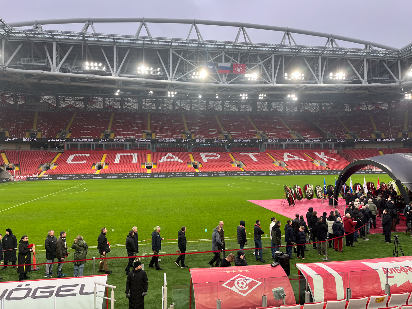 Ближе к концу панихиды, как будто это было специально задумано, начинается дождь: футбольные болельщики называют его «спартаковской погодой». Многие из них остались ждать окончания церемонии прощания на центральной трибуне А, которая отныне будет носить имя Симоняна.