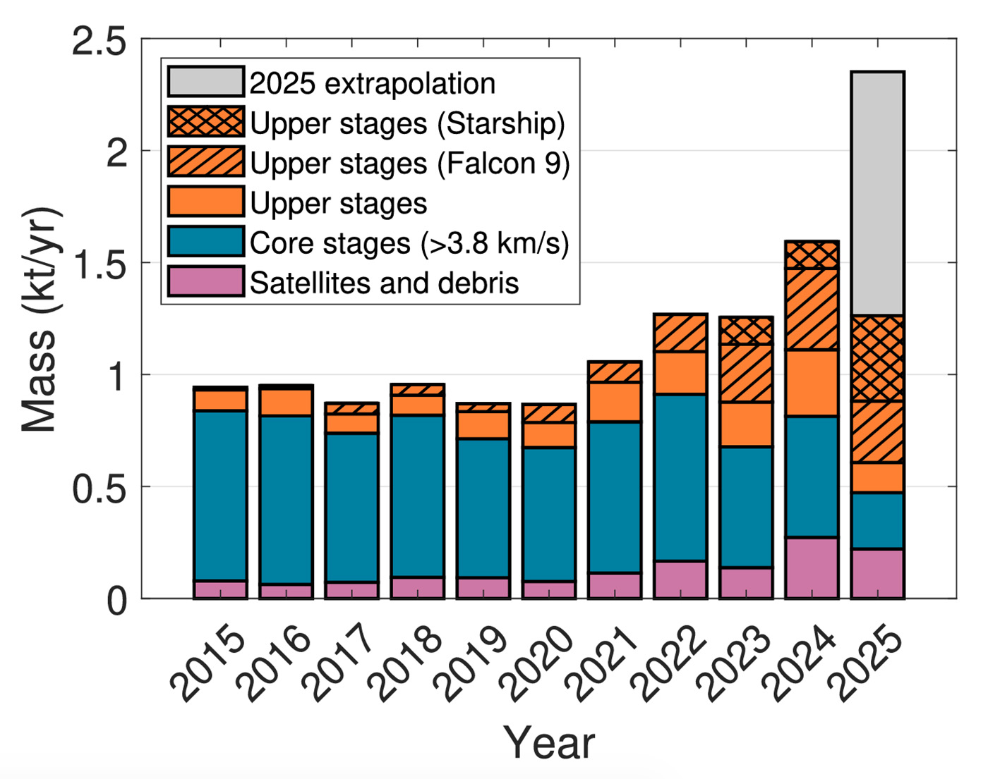 В работе приводится диаграмма, иллюстрирующая резкий рост массы падающих на Землю и частично сгорающих космических обломков в последние несколько лет, и главный фактор этих изменений — ракеты Илона Маска. На диаграмме видно резкое увеличение доли вторых ступеней ракет Falcon 9 и вторых ступеней Starship в мировом балансе массы космических объектов, входящих ежегодно в атмосферу Земли.
