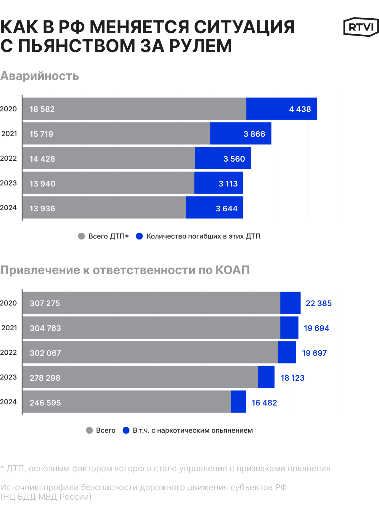 Помогло ли это сделать дороги безопаснее? Если следовать данным Научного центра безопасности дорожного движения МВД России, то да. Водителей в нетрезвом состоянии задерживают все меньше. Количество аварий с нетрезвыми водителями за пять лет (2020-2024 гг.) сократилось на 25%, число погибших в них — на 19%. В первом полугодии этого года произошло снижение еще на 12% и 31% соответственно.