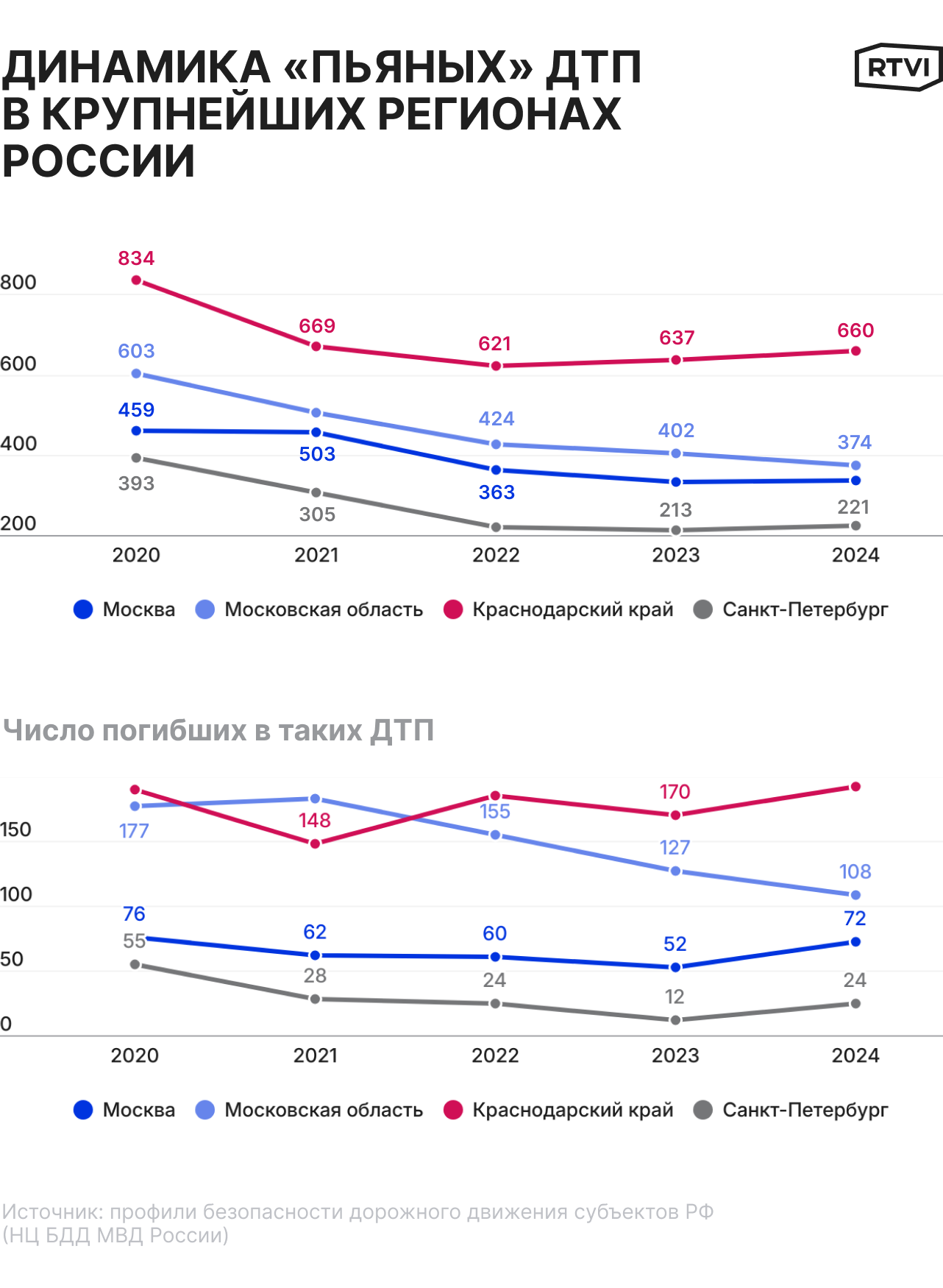 При этом больше всего ДТП с нетрезвыми водителями ожидаемо было зарегистрировано в крупнейших регионах страны. Лидером стал Краснодарский — 660 ДТП за год, 192 погибших. В тройке антилидеров также Нижегородская область (405) и Приморский край (404), по числу погибших — Забайкальский край (114) и Ростовская область (109). Однако можно ли считать, что в этих регионах риски стать жертвой пьяного водителя выше, чем в других?
