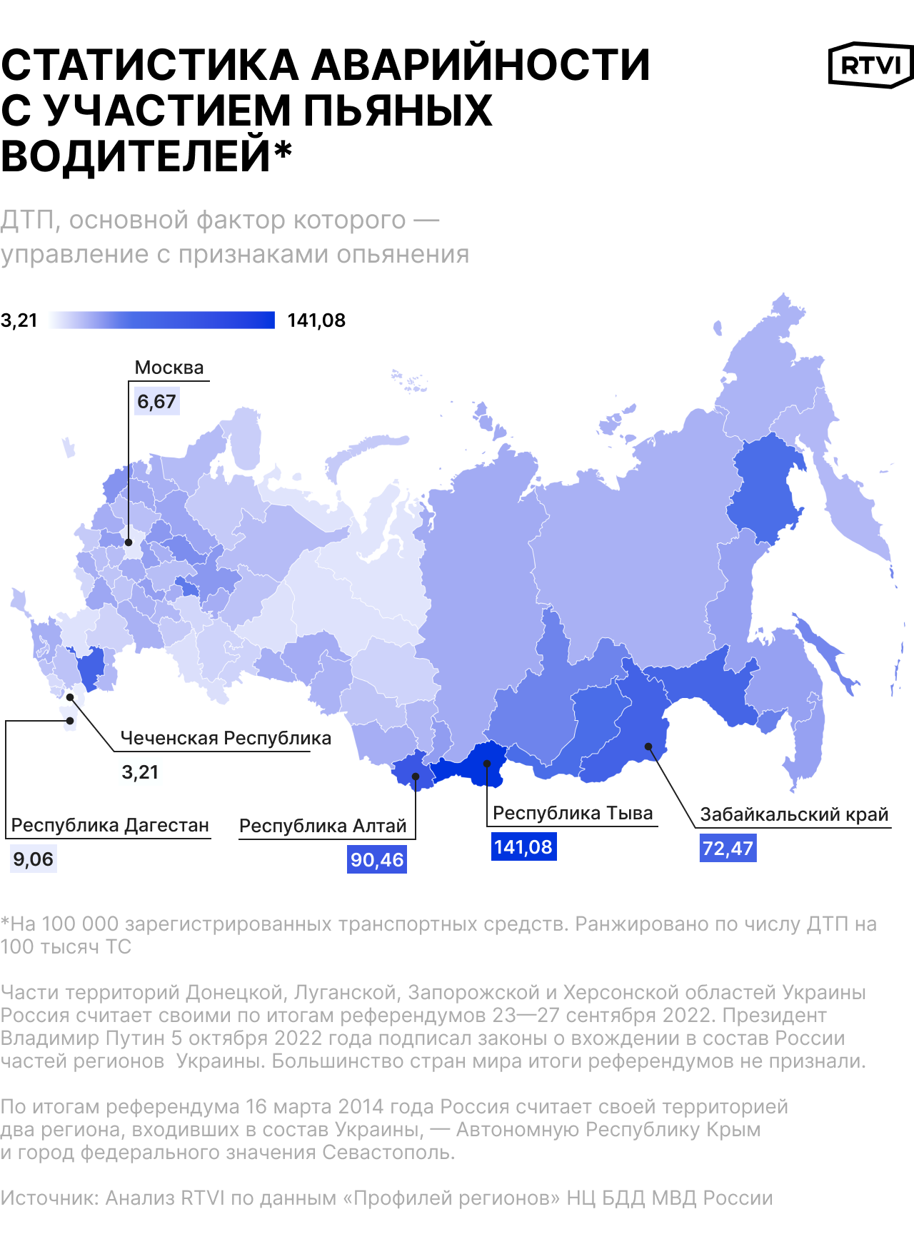 Где в России есть больше всего шансов погибнуть от водителя-алкоголика или попасть в ДТП с его участием? Анализ данных ГИБДД, проведенный RTVI, показывает, что максимальный риск погибнуть существует если двигаетесь по дорогам Тывы и Забайкальского края, а попасть в аварию — на Алтае.