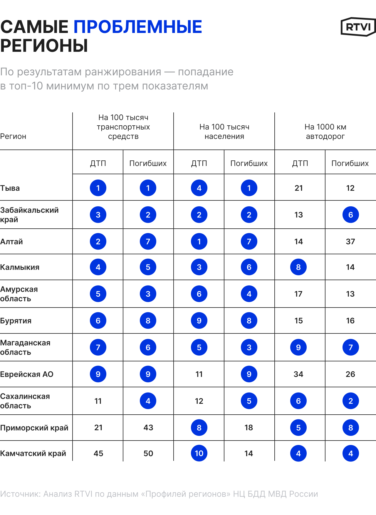 Соотношение аварийности с уровнем автомобилизации увело в отрыв все ту же Тыву — 141 ДТП на каждые 100 тысяч единиц зарегистрированного на ее территории транспорта. В следующей за ней республике Алтай показатель — 90,5. Плюс-минус 70 ДТП — в Забайкальском крае, Калмыкии, Амурской области.