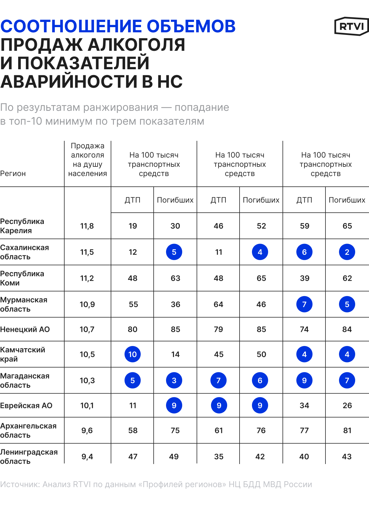 В то же время в десятке «самых пьющих» регионов также есть Карелия и Коми, Ненецкий автономный округ, Архангельская и Ленинградская области, а показатели аварийности с участием пьяных водителей на этих территориях близки к минимальным.