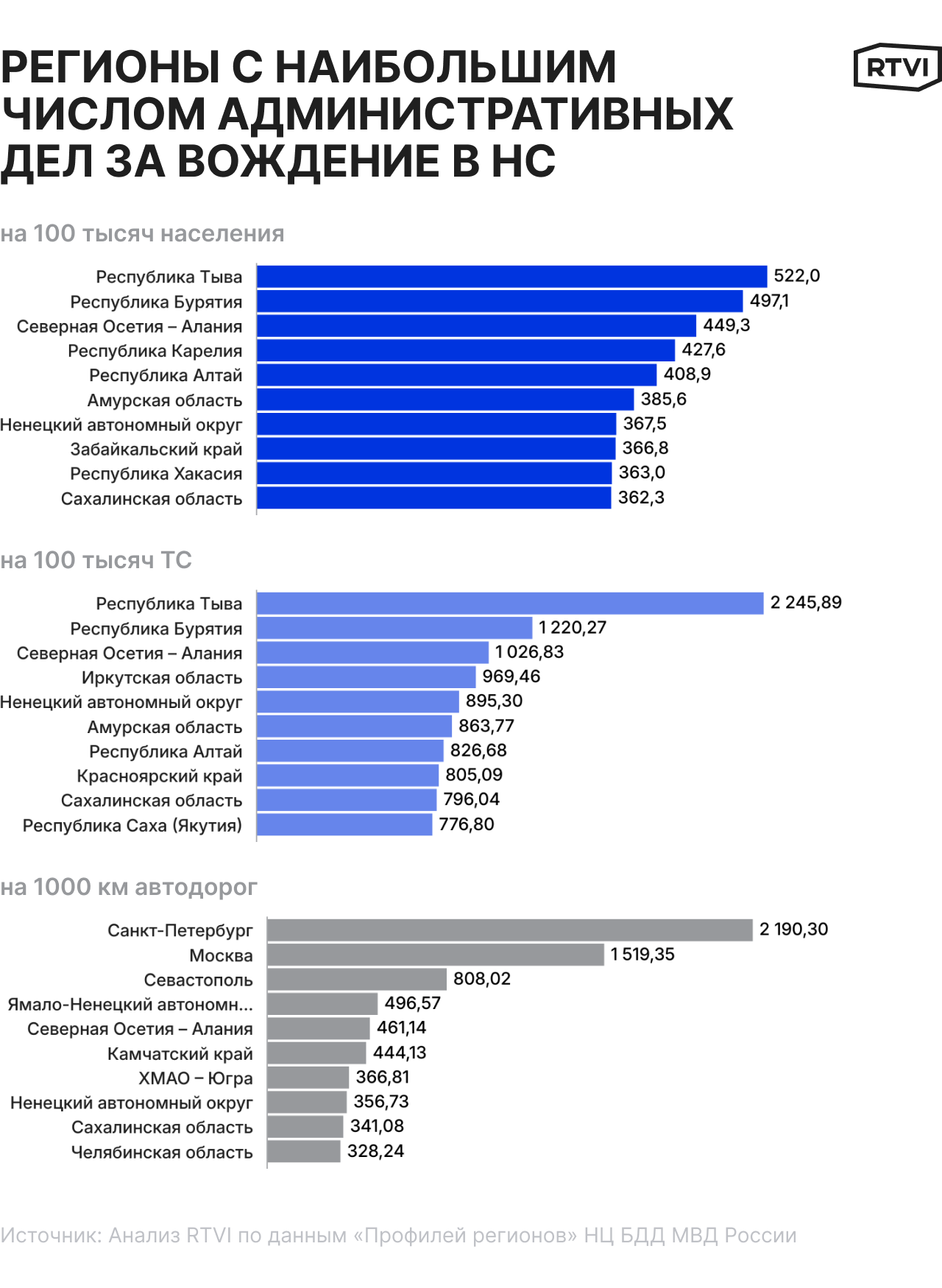 Больше всего административок за пьяное вождение также в этих проблемных регионах. На первом месте — Тыва, где на каждые 100 тысяч человек приходится по 522 административных дела за управление в нетрезвом состоянии, на втором — Бурятия (497). В ТОП-10 вошли также Алтай, Амурская область, Забайкальский край и Сахалинская область. Среди относительно благополучных регионов — Северная Осетия, Карелия, Ненецкий округ и Хакасия.