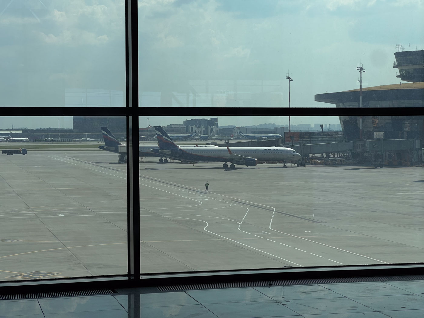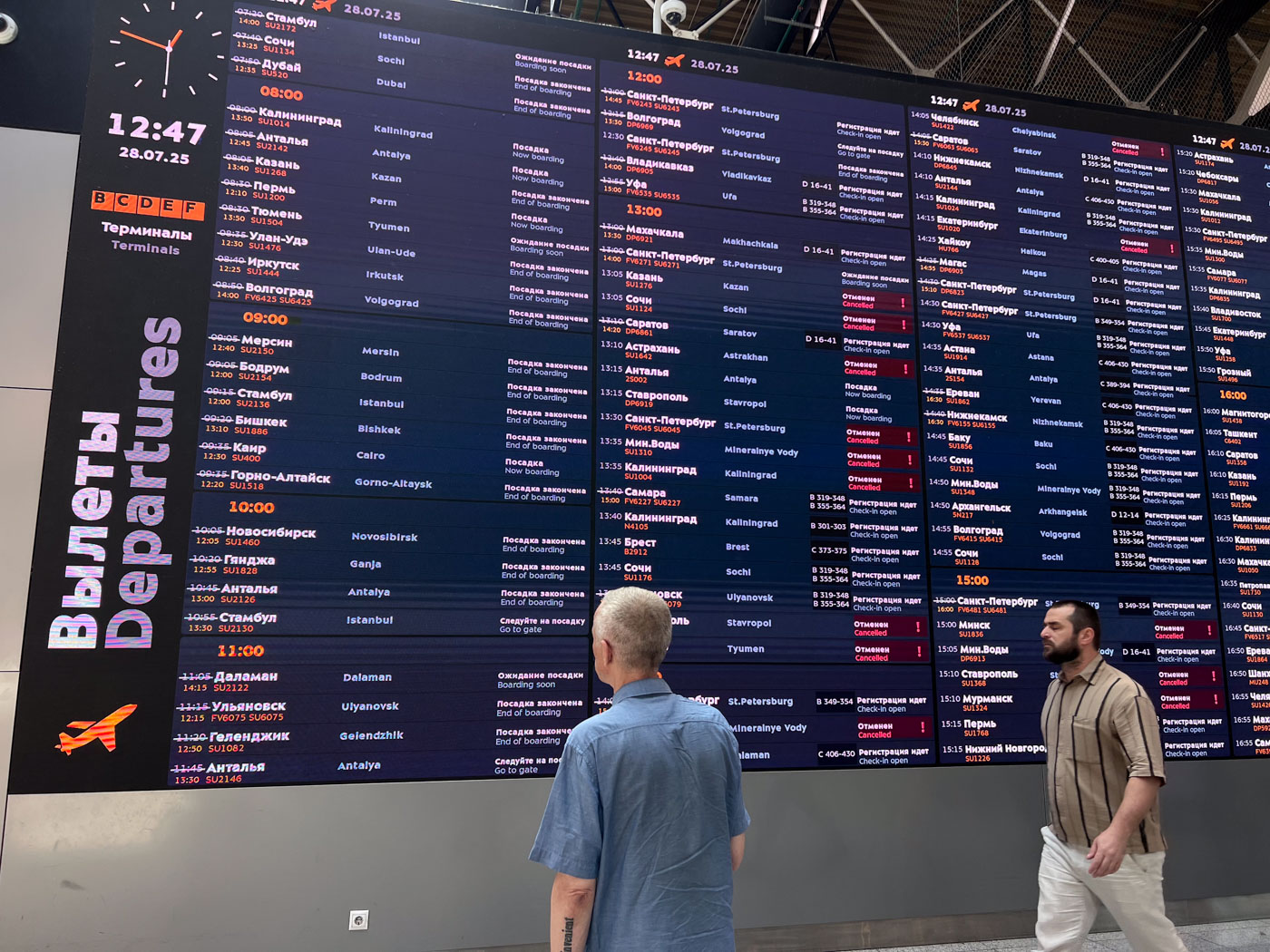 Около информационной стойки международного аэропорта Шереметьево толпятся люди. Их тут совсем мало — не так, как в прошлый понедельник, когда из-за ночной атаки беспилотников в Шереметьево отменили полтысячи вылетов.