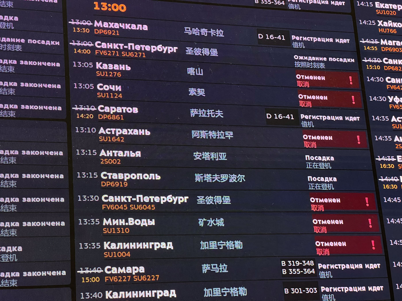 Около другой стойки, которая находится совсем рядом с информационным табло, где поминутно обновляется время вылета междугородних рейсов, пара человек внимательно слушает сотрудника авиакомпании. Вопрос у всех один: «что делать, если рейс отменили».