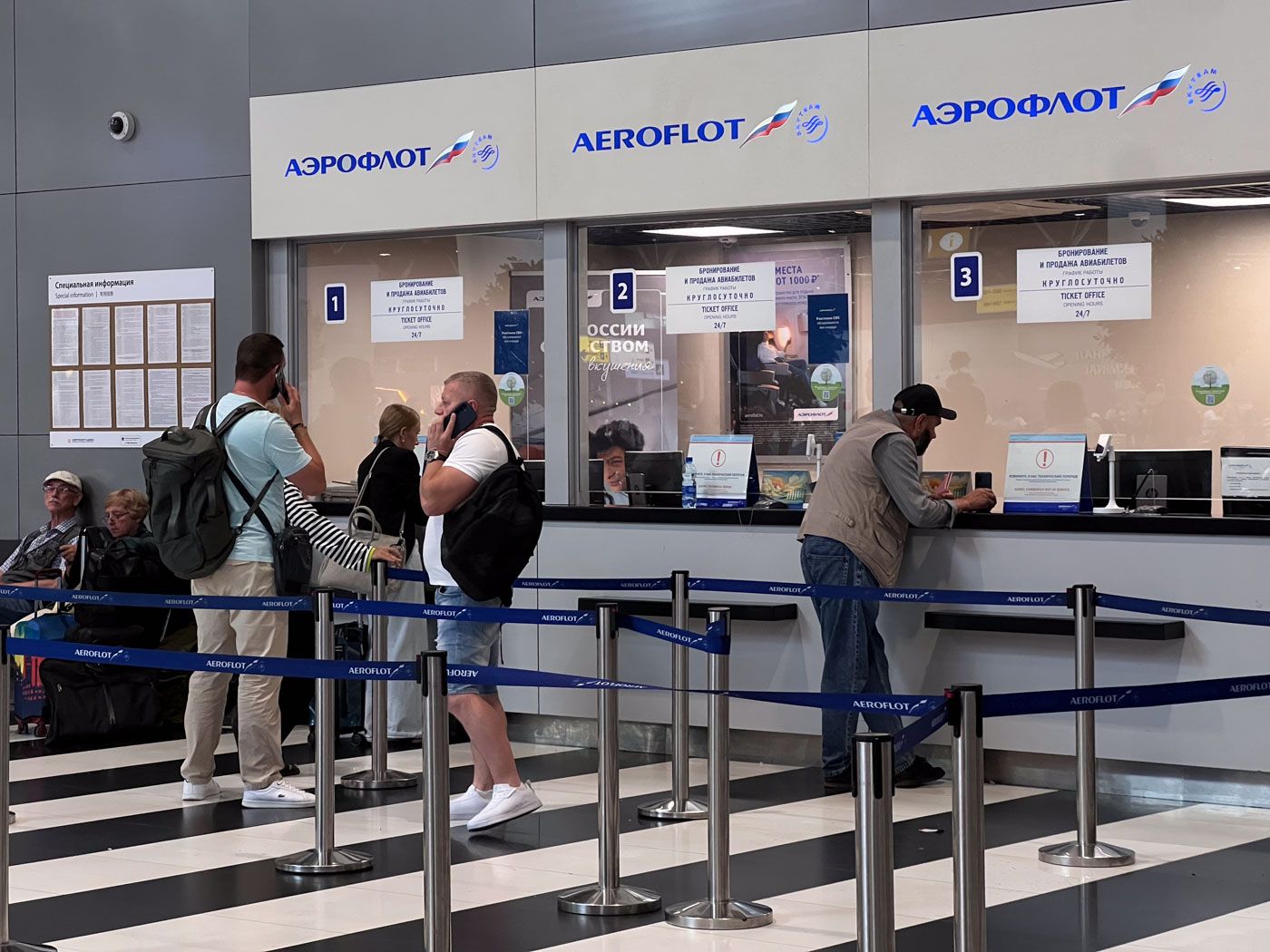 — Мы тоже билеты продаем, но не на все рейсы. Некоторые рейсы отменены и на них, соответственно, и продажи нет. На завтра, например, можете купить билет «Аэрофлотом», сайт у нас работает, но мы не знаем, будут ли отменены эти рейсы, — спокойно разъясняет сотрудник авиакомпании подошедшим пассажирам.
