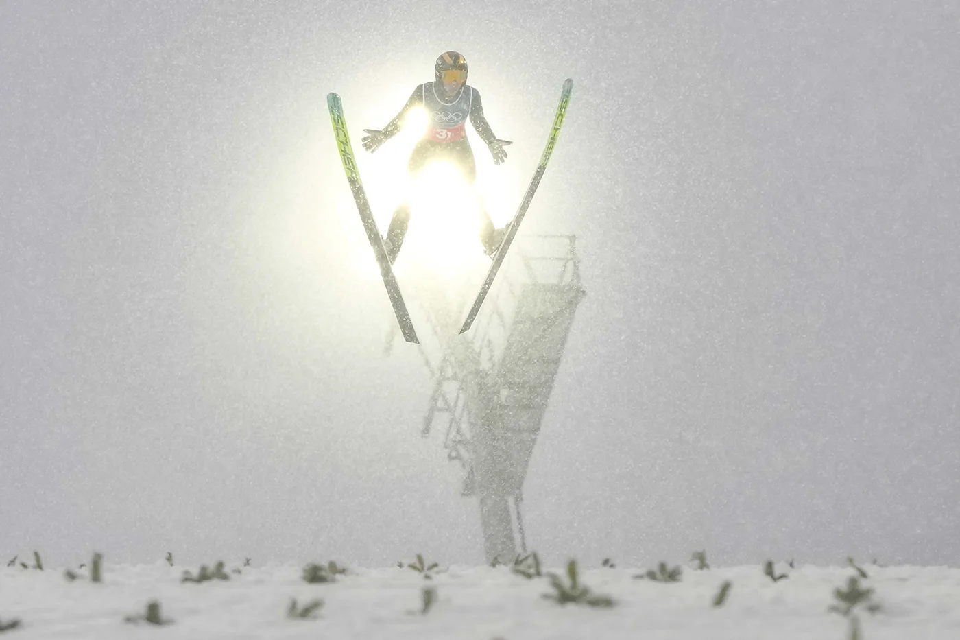 Чжао Цзихэ из Китая парит в воздухе во время своего прыжка в дисциплине «круговое движение» в командном спринте по северному многоборью на зимних Олимпийских играх 2026 года в Предаццо. Италия