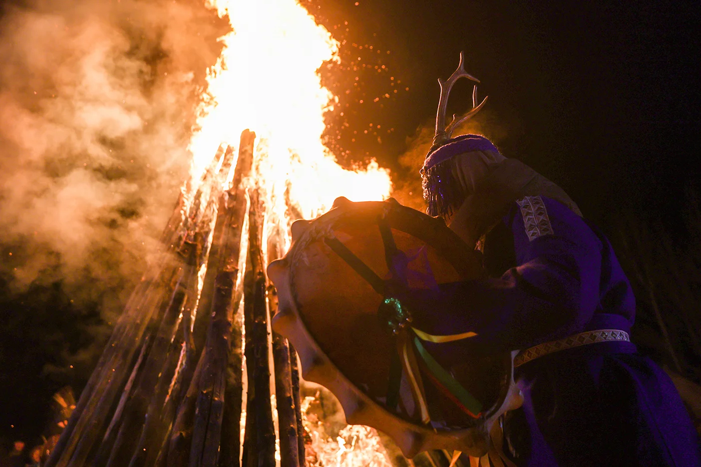 Обряд возжигания священного огня в рамках встречи Шагаа в Тыве, Кызыл, Россия