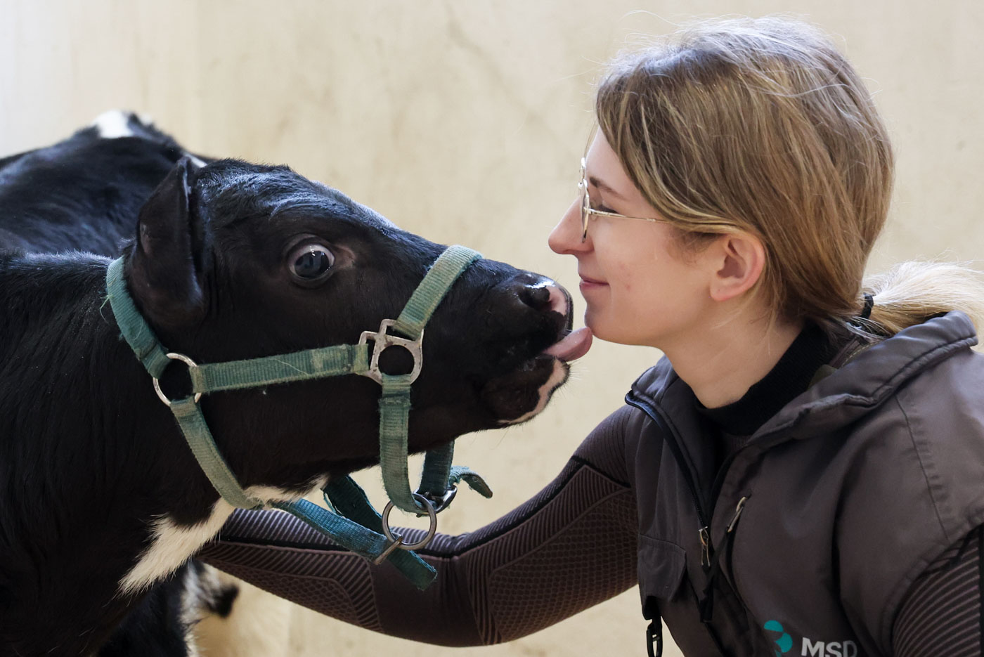 Студентка факультета ветеринарной медицины Елизавета Бахтурина и теленок Протос («Первый»), полученный методом IVP (экстракорпоральное получение эмбрионов) в собственной лаборатории Санкт-Петербургского государственного университета ветеринарной медицины, Санкт-Петербург, Россия, 5 марта 2026 года