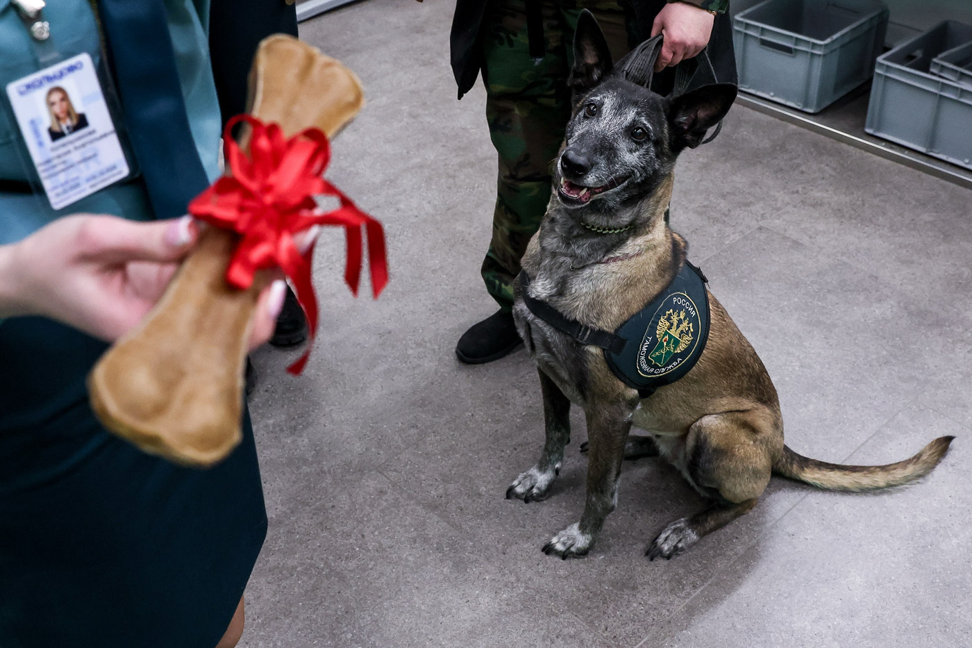 Бельгийская овчарка Норвегия во время церемонии выхода на пенсию после восьми лет службы в Кольцовской таможне имени В.А. Сорокина. Екатеринбург, Россия