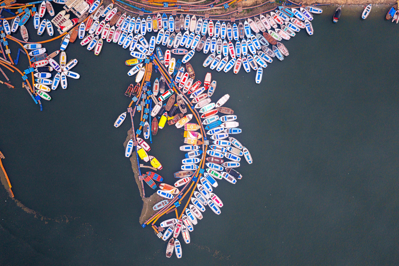 Лодки индуистских паломников, которые отмечают праздник Васант-панчами, знаменуемый приход весны. Место слияния рек Ганг и Ямуна, Праяградж, Индия