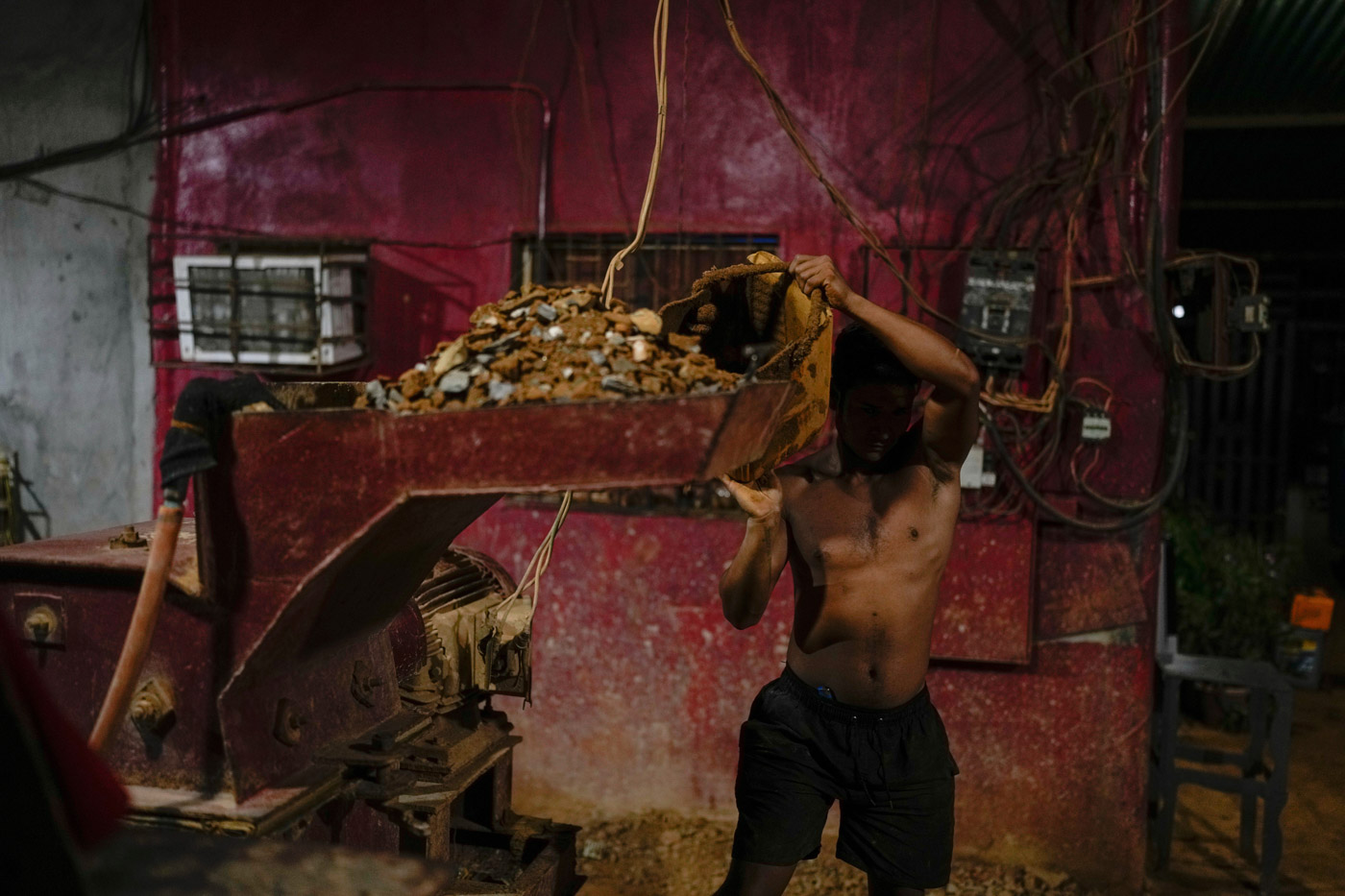 Мужчина загружает камни и грунт в машину-дробилку на фабрике, которая перерабатывает материал из близлежащих карьеров для добычи золота. Эль-Кальяо, Венесуэла
