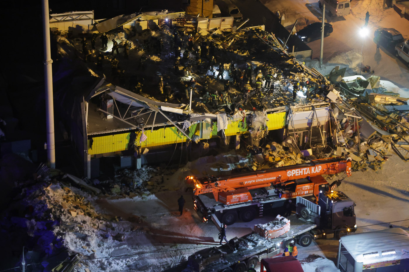 Разбор завалов на месте обрушения двухэтажного торгового центра на улице Болдырева в Новосибирске. В здании произошло обрушение кровли, три человека пострадали, один из них умер. Владельца ТЦ арестовали