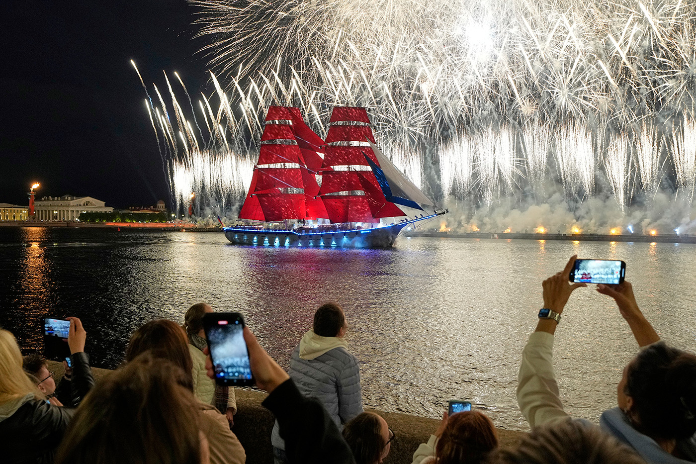 Бриг с алыми парусами плывет по Неве во время праздничных мероприятий, которые посвящены окончанию школы. Санкт-Петербург, Россия, 29 июня 2025 года