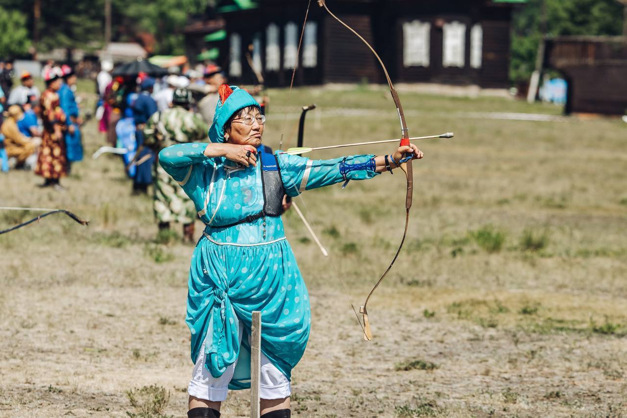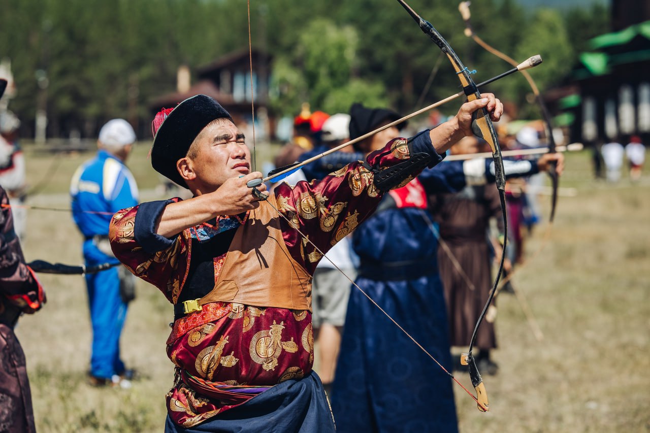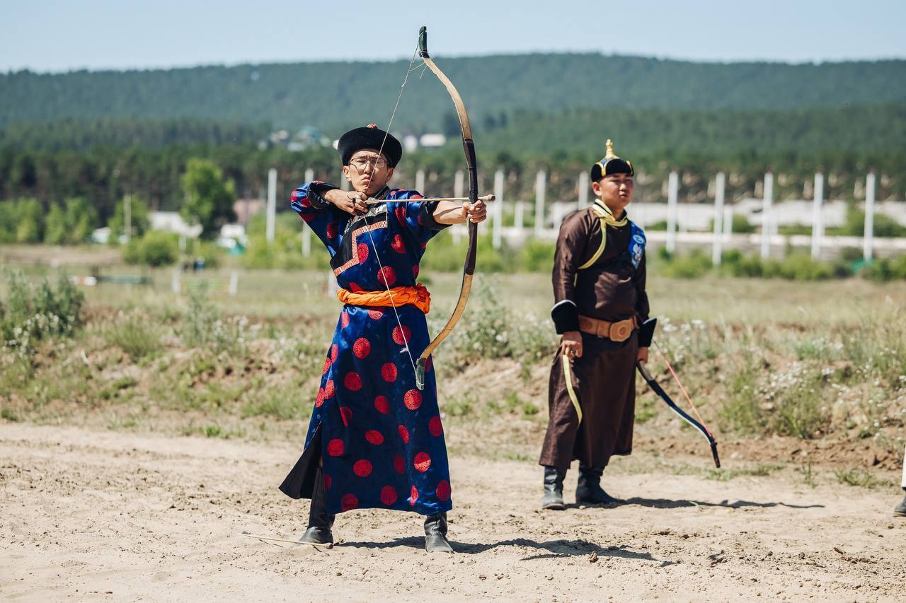 Одним из самых зрелищных состязаний является стрельба из традиционного бурятского лука, который делается из березы и покрывается пластинами из рога буйвола, а с внешней стороны для эластичности обклеивается конскими сухожилиями.