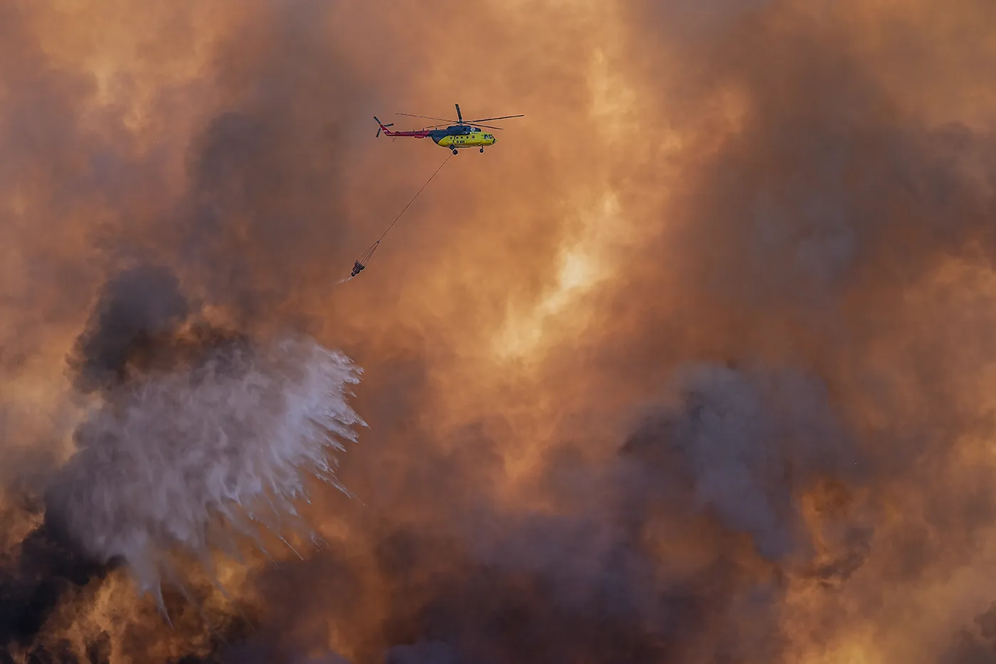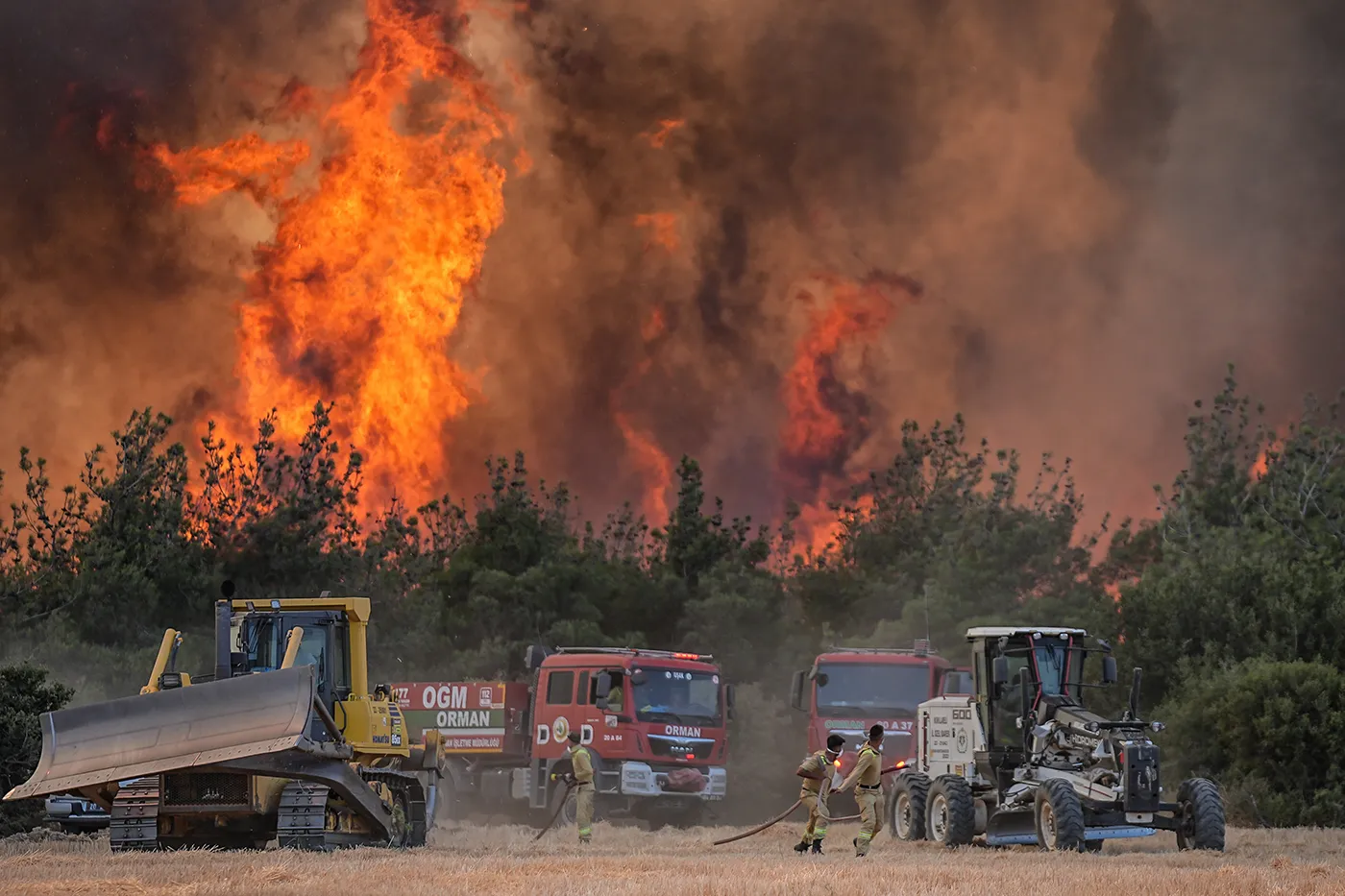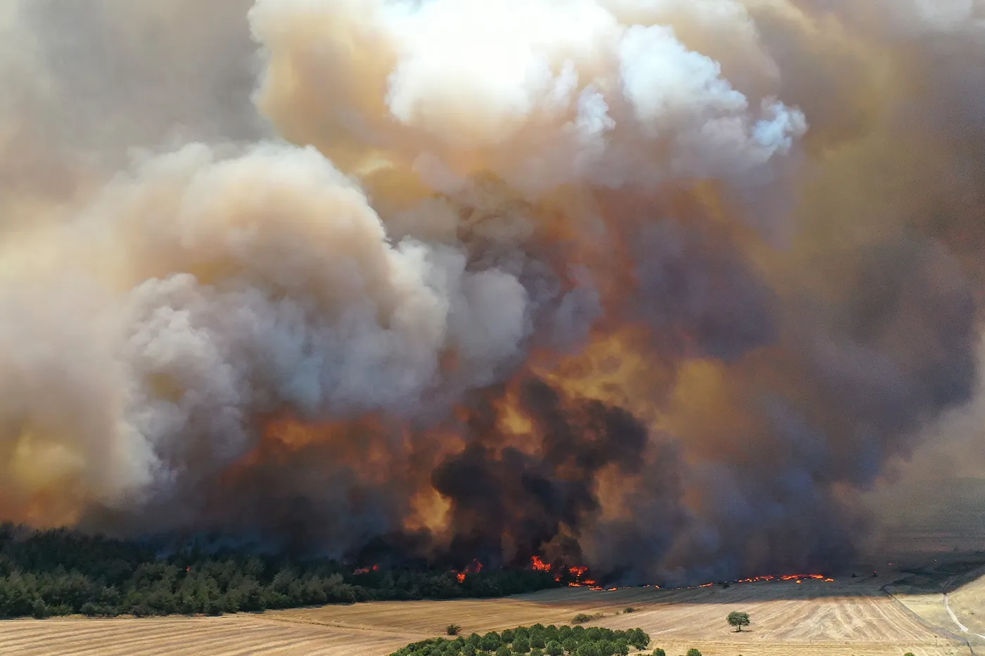 Турция, провинция Чанаккале, 16 июля 2025 года. В районе Гелиболу пожарные борются с лесным пожаром, начавшимся на сельскохозяйственных землях. Воздушные и наземные команды продолжают тушение огня, в то время дым поднимается над выгоревшим лесом.
