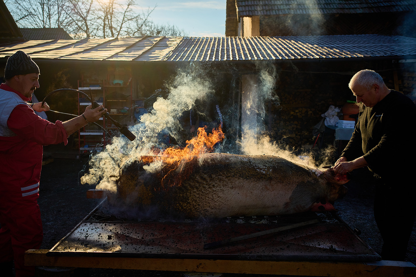 Люди опаливают шерсть со свиной туши. По традиции в день св. Игната закалывают свиней для приготовления рождественских блюд. Деревня Косешти, Румыния