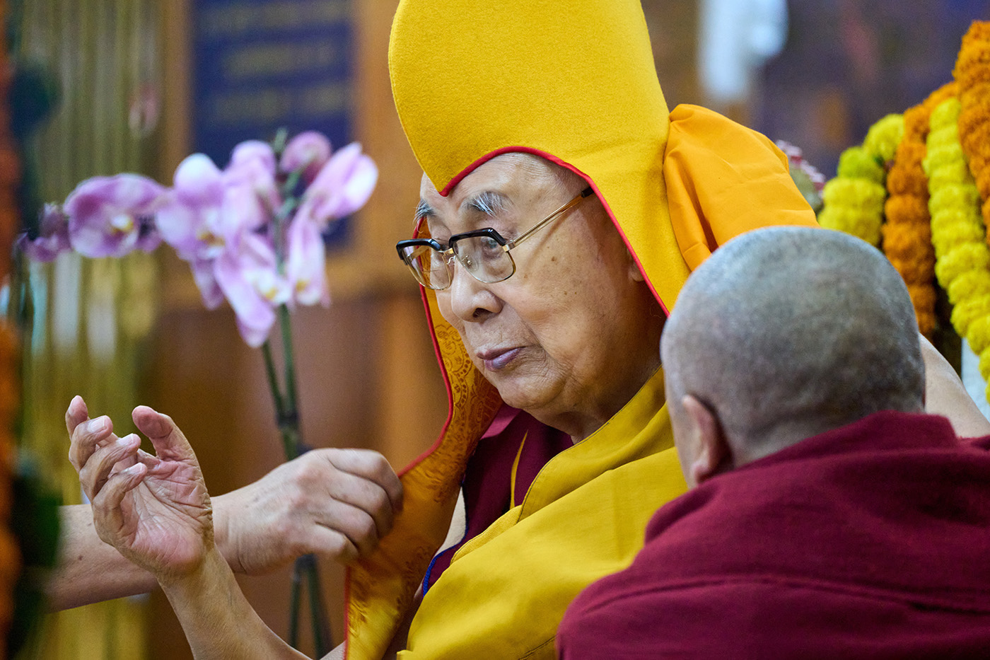 Монахи помогают тибетскому духовному лидеру Далай-ламе надеть церемониальную шапку перед молебном в Дхарамсале, Индия