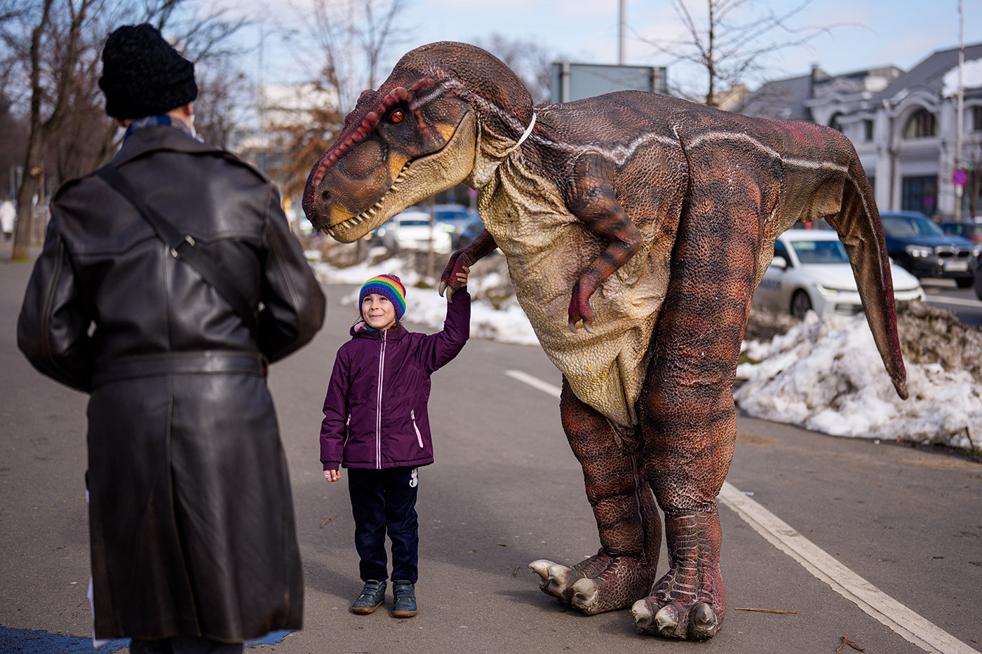 Ребенок встретил динозавра у входа в дино-парк в центре Бухареста, Румыния