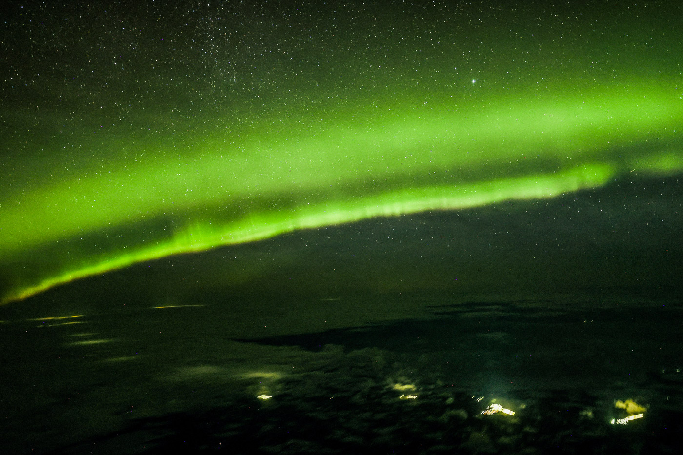 Вид на ночное небо и северное сияние во время пика метеорного потока Геминиды с борта самолета. Проект Astro Night при поддержке «Роскосмоса» запустил в ночь с 13 на 14 декабря специальный авиарейс для наблюдения с высоты 10 тысяч метров