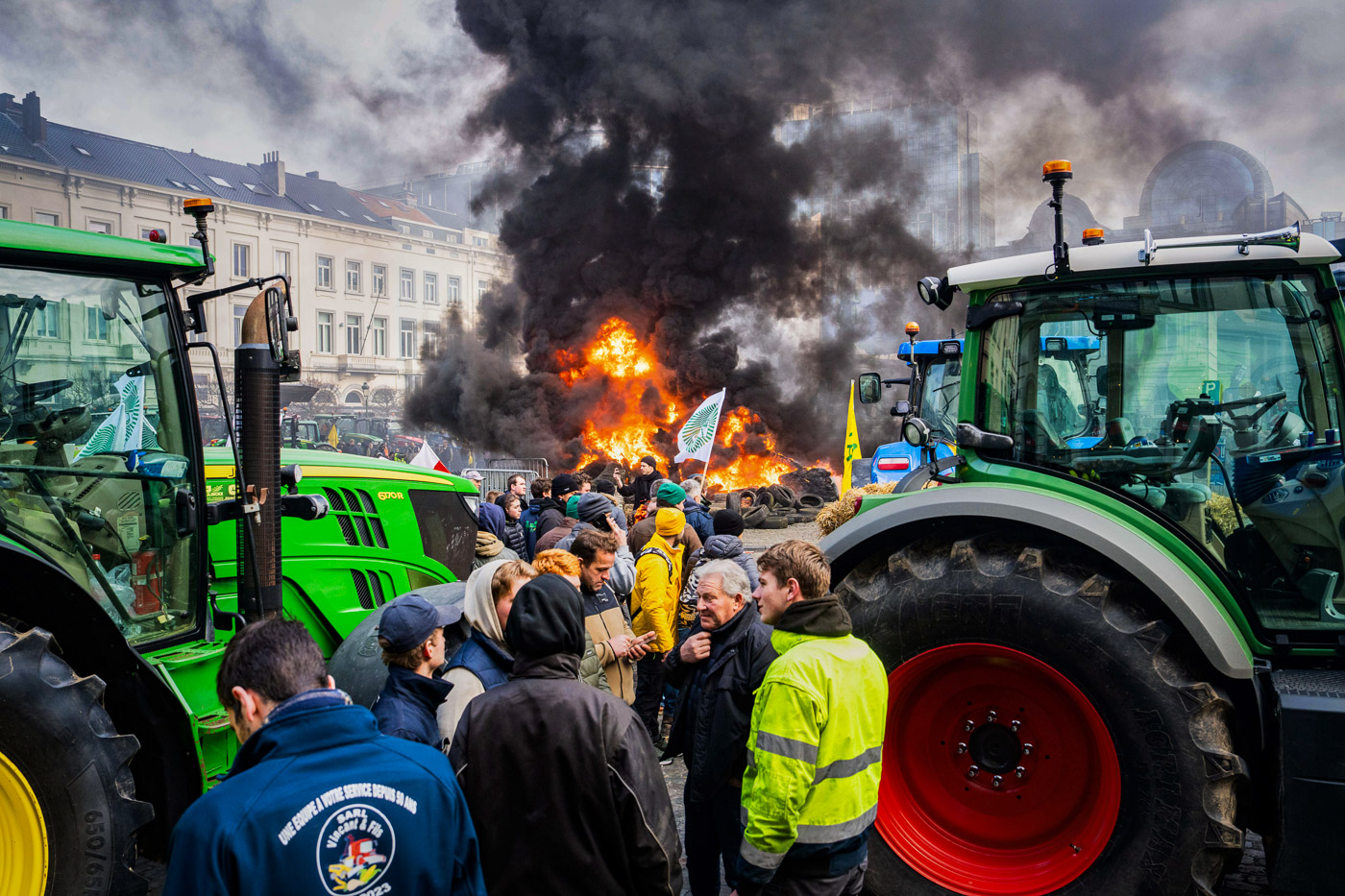 Протестующие стоят рядом с тракторами на фоне горящих шин во время демонстрации европейских фермеров у здания саммита ЕС в Брюсселе