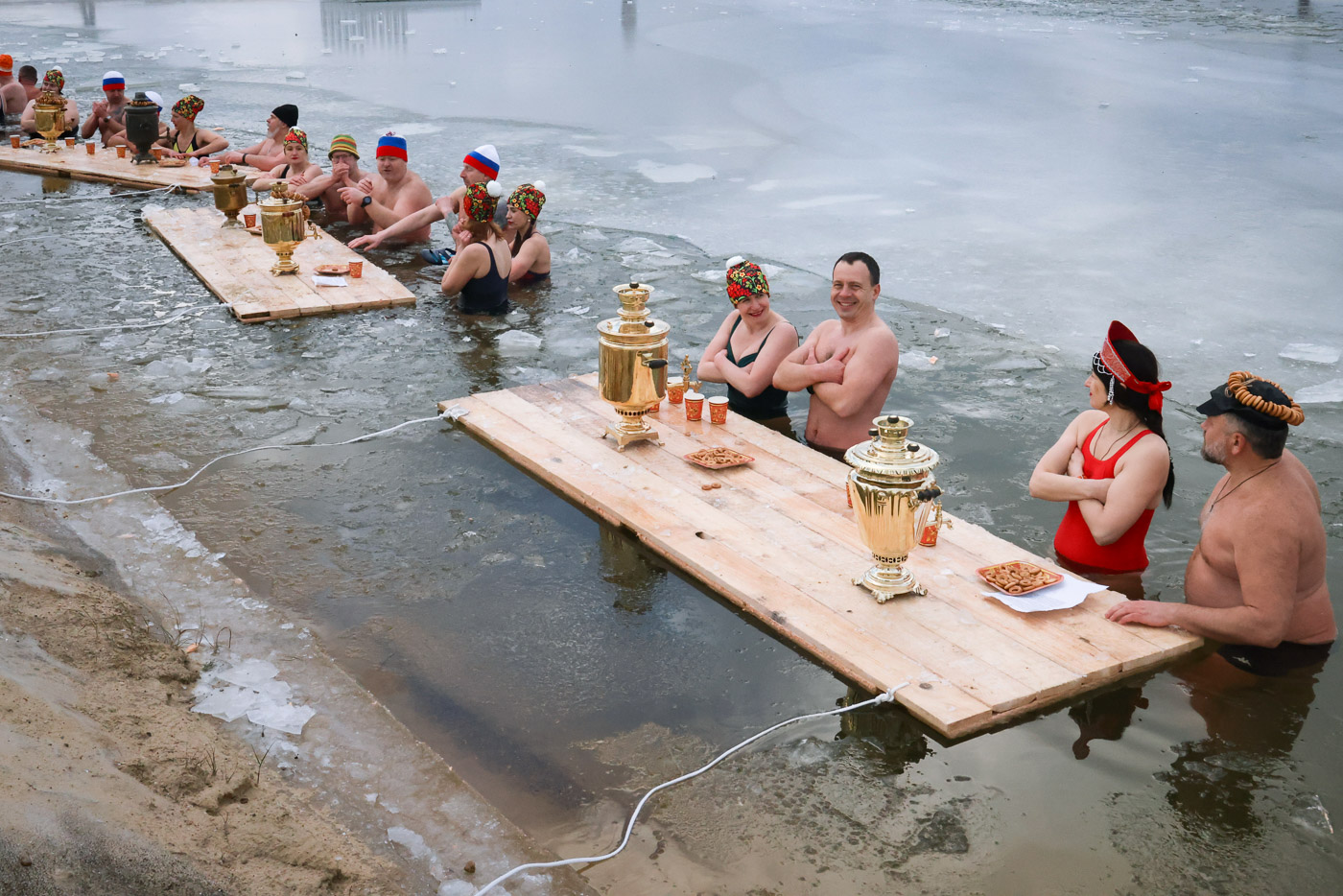 Купальщики во время установления рекорда России — «Самое массовое чаепитие в проруби» — 30 «моржей» в течение 15 минут пьют чай из 15 самоваров, пока находятся в ледяной воде. Малоярославец, Калужская область, Россия