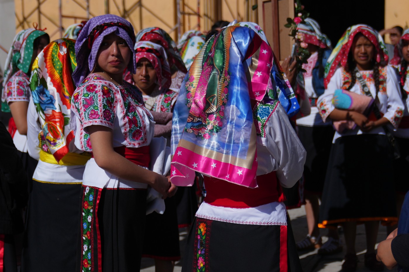 Девушки в платках с изображением Девы Гваделупской в день ее праздника у церкви в муниципалитете Сан-Исидро-Буэн-Сусесо, Тласкала, Мексика