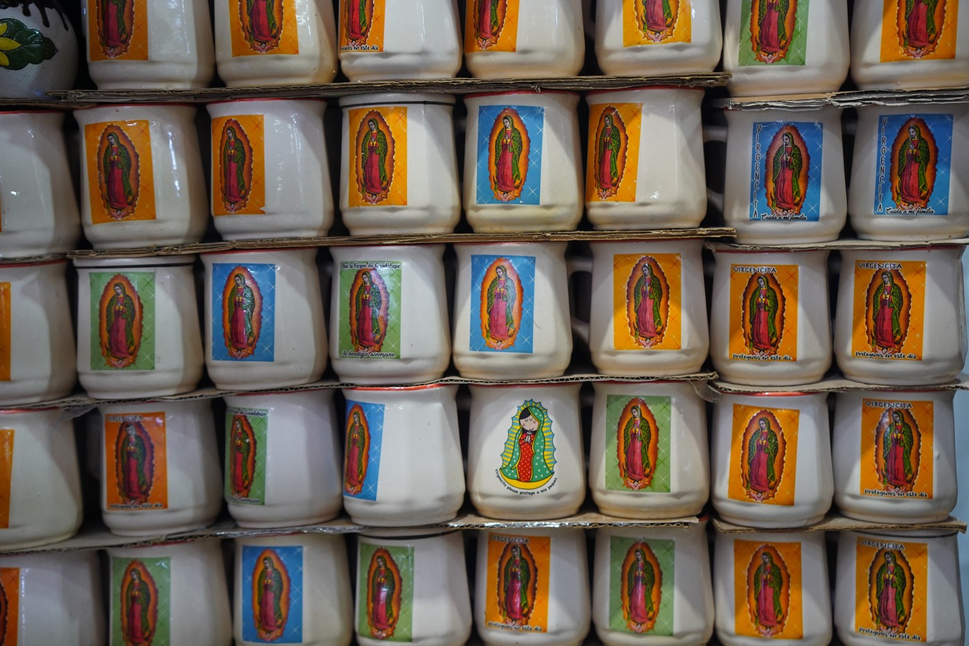 Кружки с изображением Девы Марии на рынке рядом с базиликой Богоматери Гваделупской в Мехико в день ее праздника