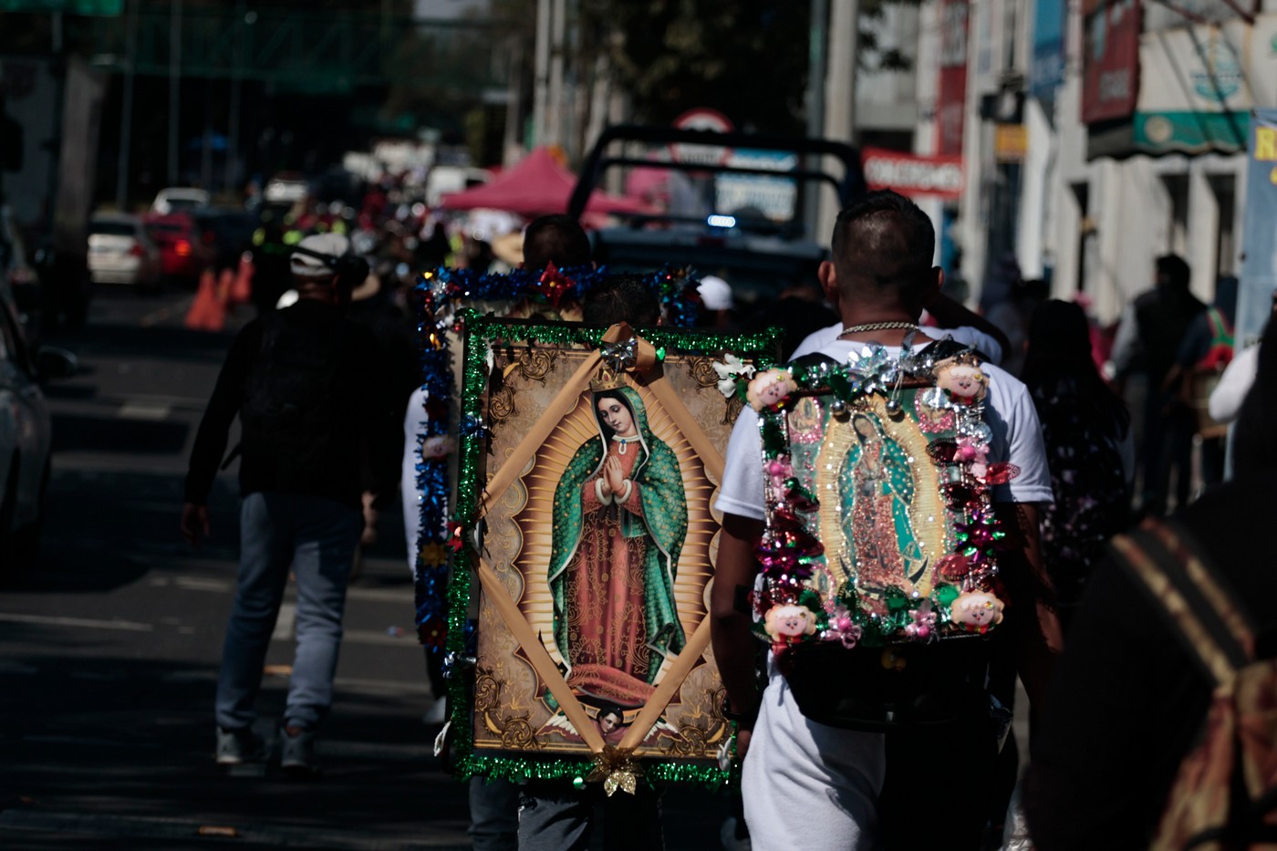 Тысячи паломников идут пешком, едут на велосипедах и автомобилях по проспекту Сарагоса. Большинство из них прибыли из штата Пуэбла, где особенно почитают Деву Гваделупскую.