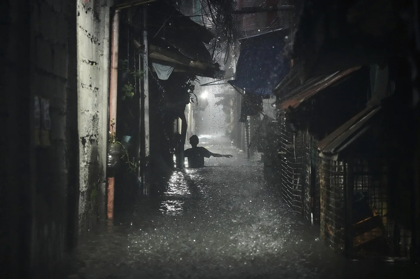 Филиппины, Кесон-Сити, 21 июля 2025 года. Мужчина идет по пояс в воде после тропического шторма «Випха», вызвавшего усиление муссонных дождей, которые привели к наводнению городе.