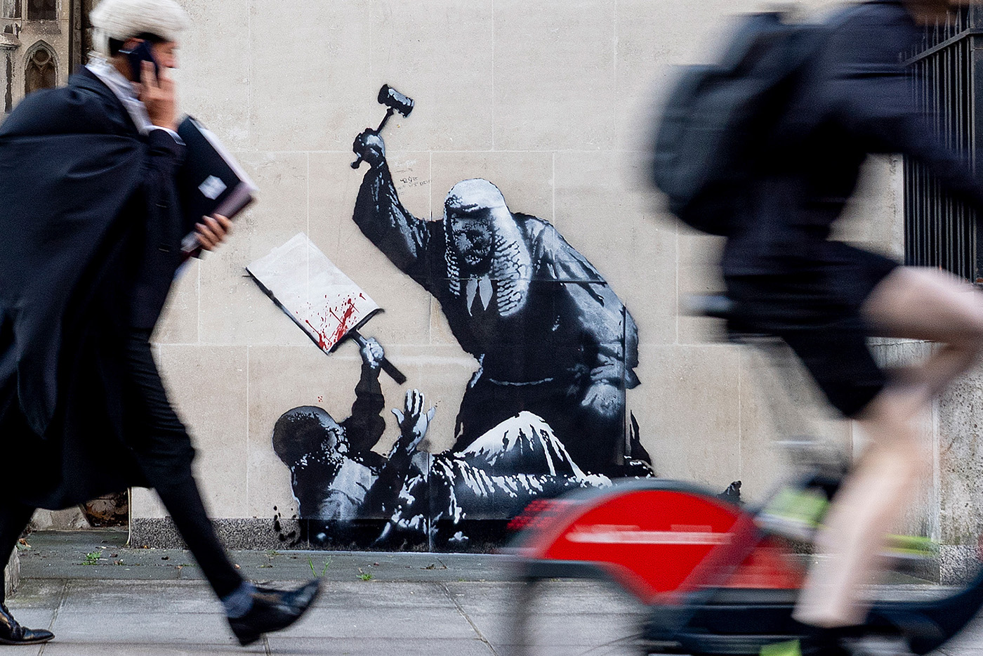 8 сентября 2025 года, Лондон, Англия. На стене здания Королевского суда правосудия в центре Лондона появился новый мурал уличного художника Бэнкси. На нем судья в традиционном парике и мантии наносит удар лежащему на земле протестующему, кровь брызжет на его плакат. Работа не связана с конкретным делом или событием, но появилась через два дня после задержания почти 900 человек на акции против запрета движения Palestine Action.