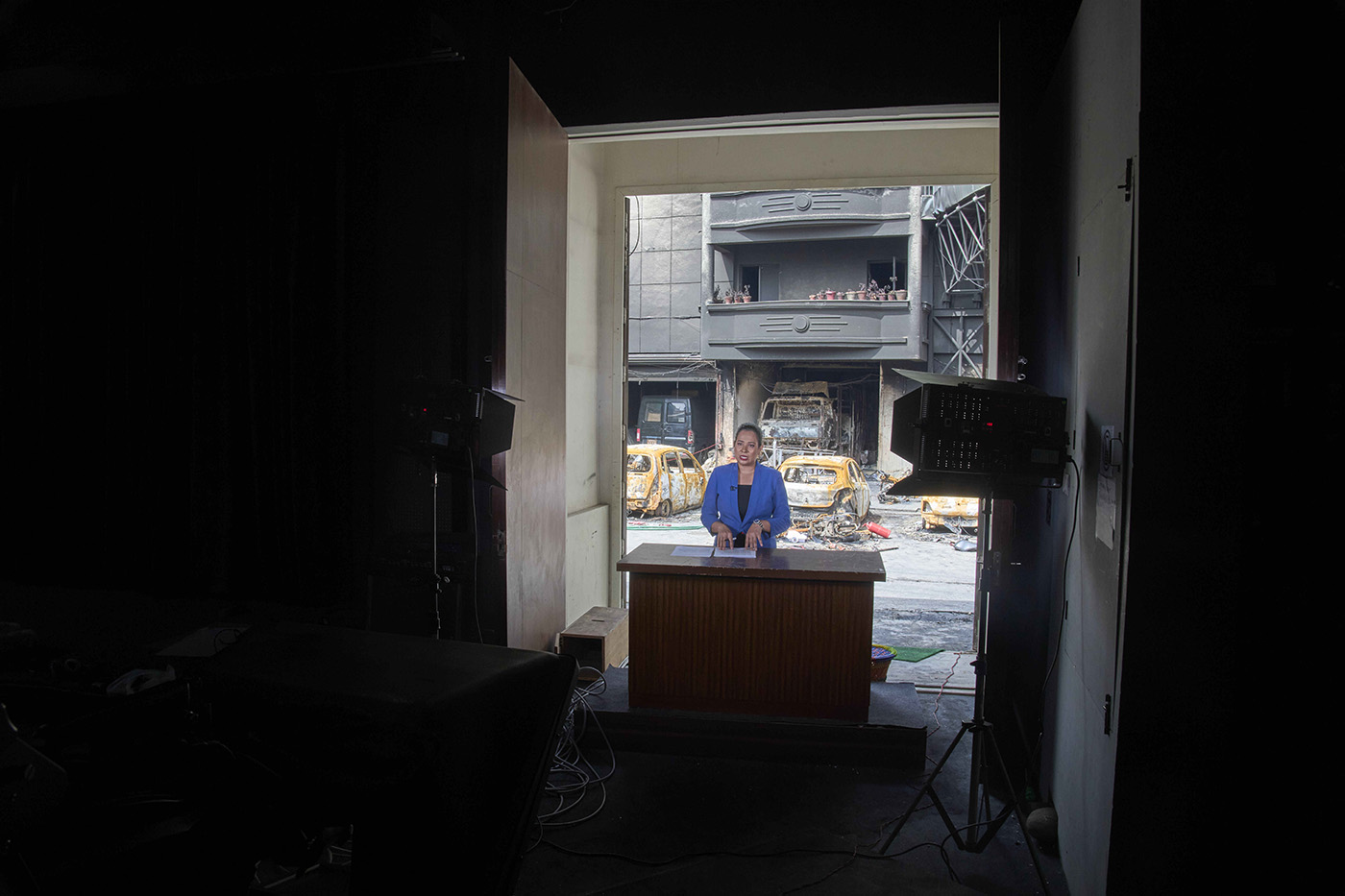 Ведущая читает новости в прямом эфире телеканала Kantipur. За её спиной видны автомобили, сгоревшие во время антикоррупционных протестов, Катманду, Непал, 13 сентября 2025 года