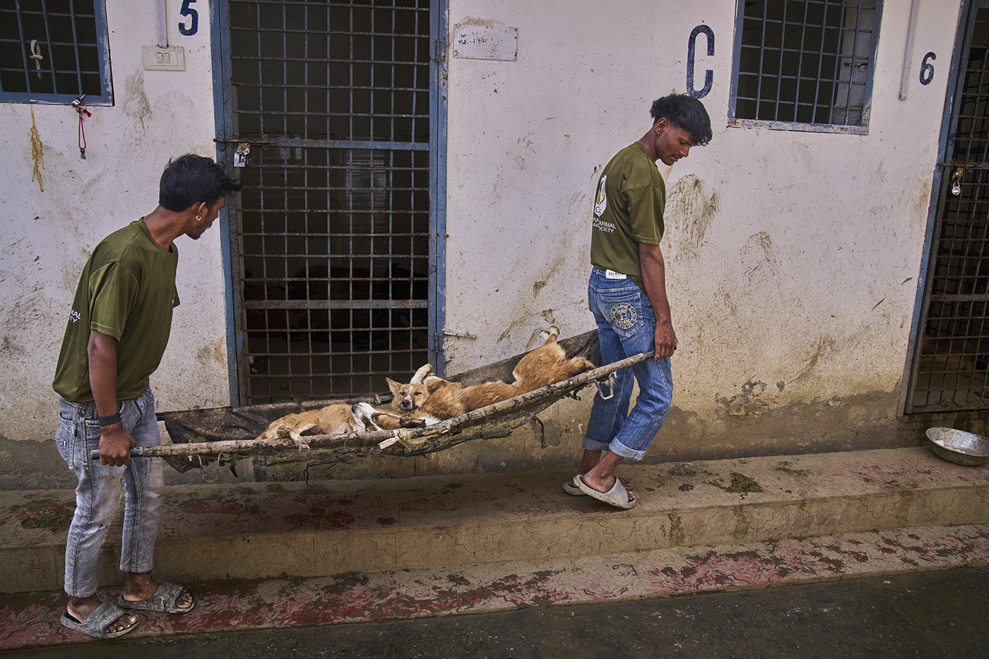 Волонтеры из организации по защите животных несут бездомных собак на носилках после стерилизации в ветеринарной клиники в Сринагаре, Кашмир, 16 сентября 2025 года