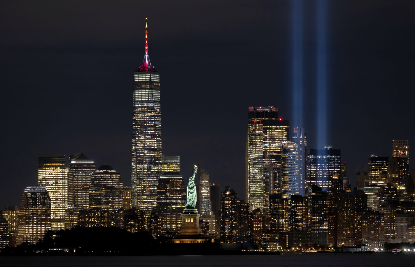 Инсталляция «Дань свету» освещает небо над нижним Манхэттеном накануне 24-й годовщины терактов 11 сентября, Нью-Йорк, США, 11 сентября 2025 года