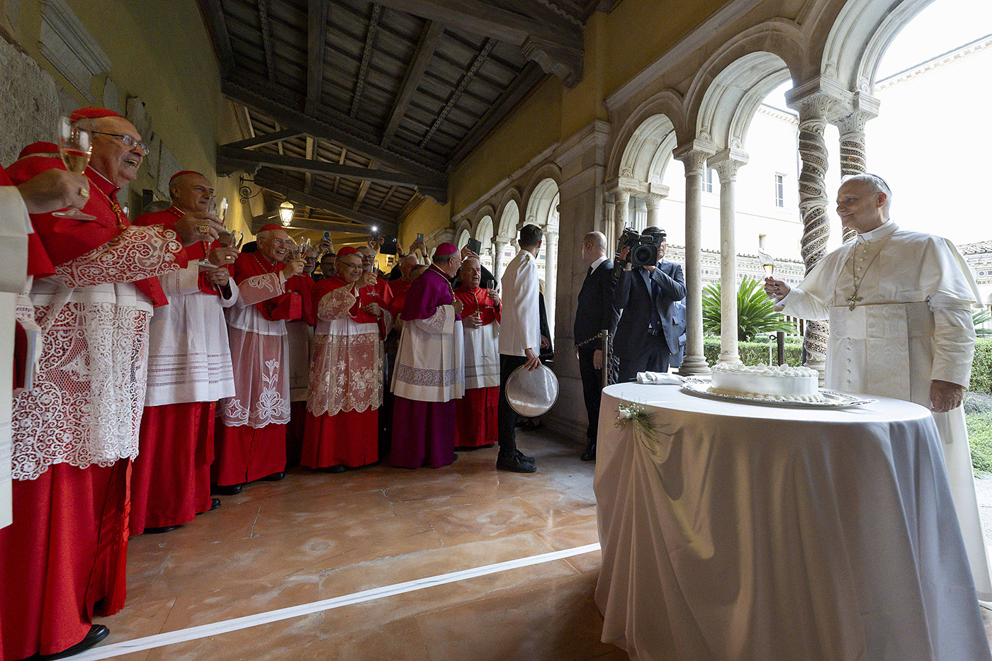 Папа Лев XIV получает праздничный торт и поздравления после «Празднования памяти мучеников и свидетелей веры XXI века» в базилике Святого Павла, Рим, Италия 14 сентября 2025 года