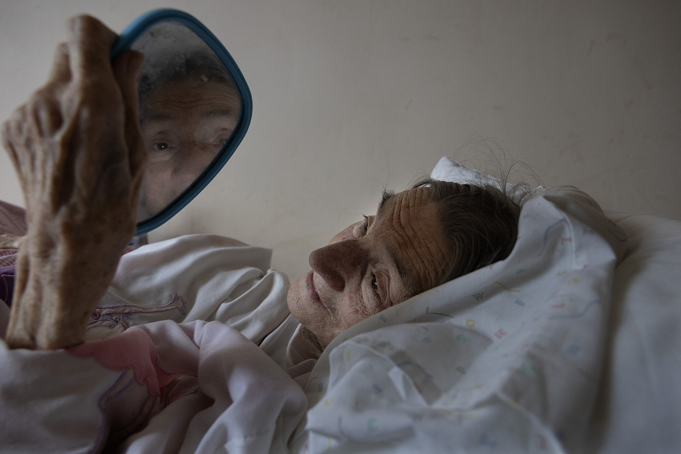 Девяностолетняя Алла, страдающая тяжелой формой деменции, держит зеркало у своей кровати, чтобы видеть, кто входит в ее комнату. Она и другие уязвимые пожилые люди, кто был вынужден переехать из-за боевых действий, живут в доме престарелых «Большая семья», Харьков, Украина, 19 сентября 2025 года