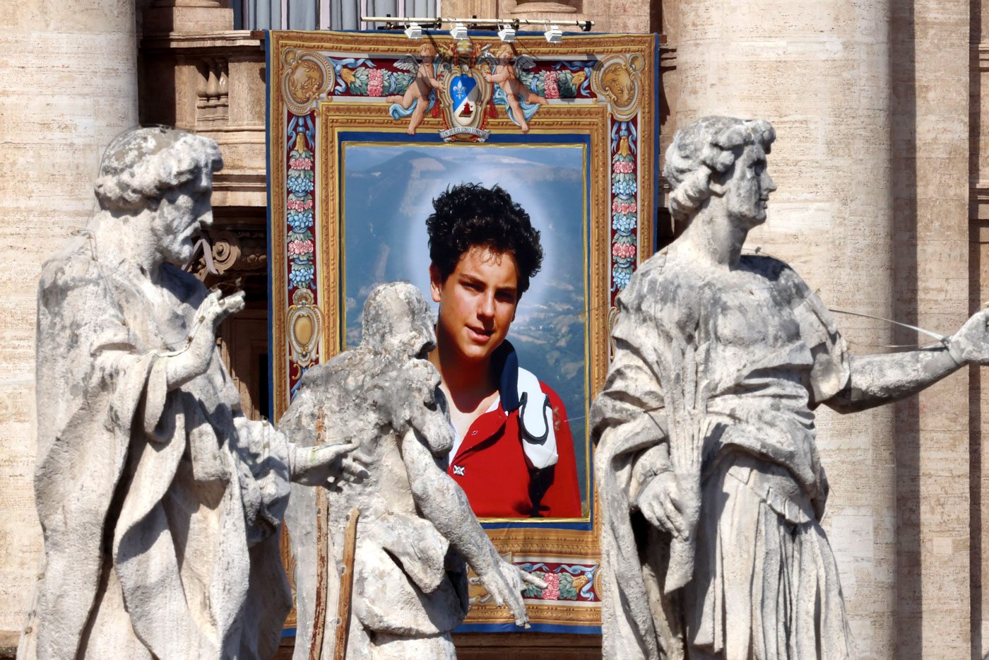 Гобелен с изображением нового святого Католической церкви Карло Акутиса висит на балконе собора Святого Петра во время церемонии канонизации, проведённой Папой Львом XIV в Ватикане, 7 сентября 2025 года