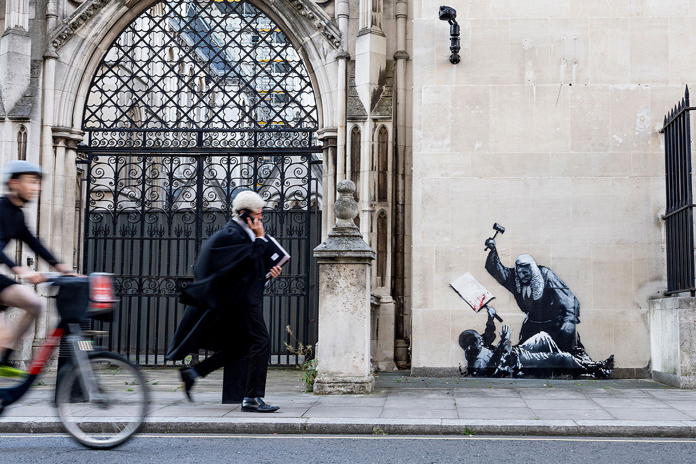 На стене здания Королевского суда правосудия в центре Лондона появился новый мурал уличного художника Бэнкси. На нем судья в традиционном парике и мантии наносит удар лежащему на земле протестующему, кровь брызжет на его плакат, Лондон, Англия, 8 сентября 2025 года