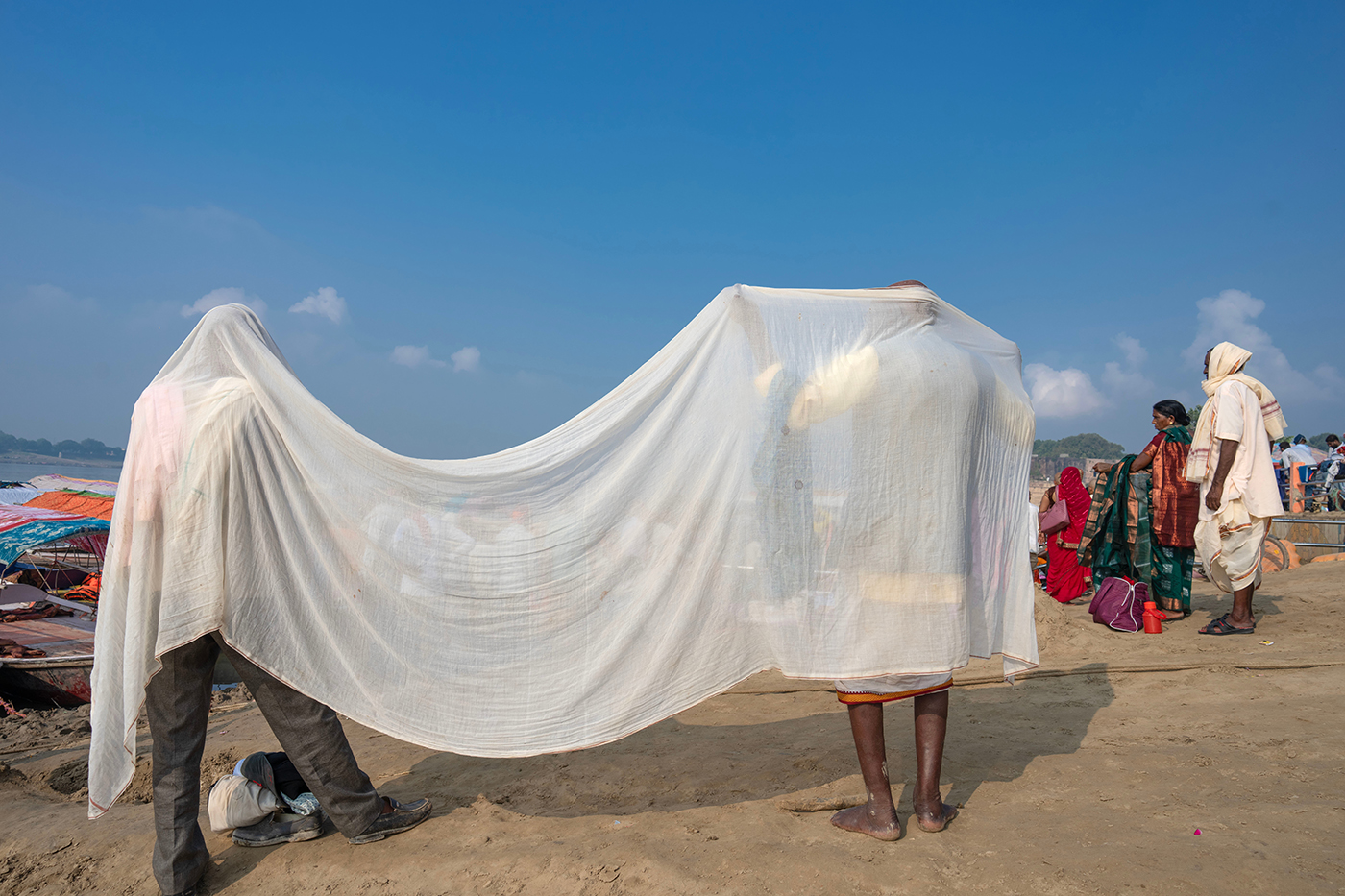 Индуисты сушат одежду после священного омовения в реке Сангаме. Праяградж, штат Уттар-Прадеш, Индия, 30 сентября 2025 года