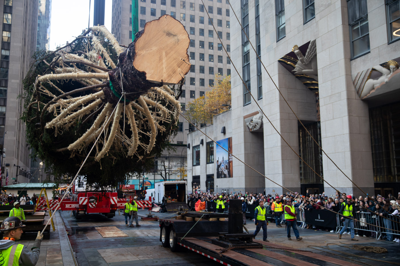 Рождественскую елку весом в 11 тонн устанавливают на площади у Рокфеллер-центра в Нью-Йорке