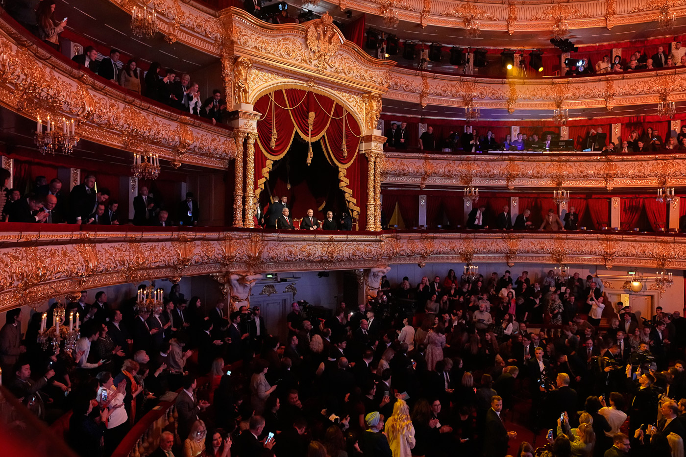Президент России Владимир Путин (в центре), президент Казахстана Касым-Жомарт Токаев (слева) и министр культуры России Ольга Любимова присутствуют на концерте мастеров искусств Казахстана в Большом театре в Москве