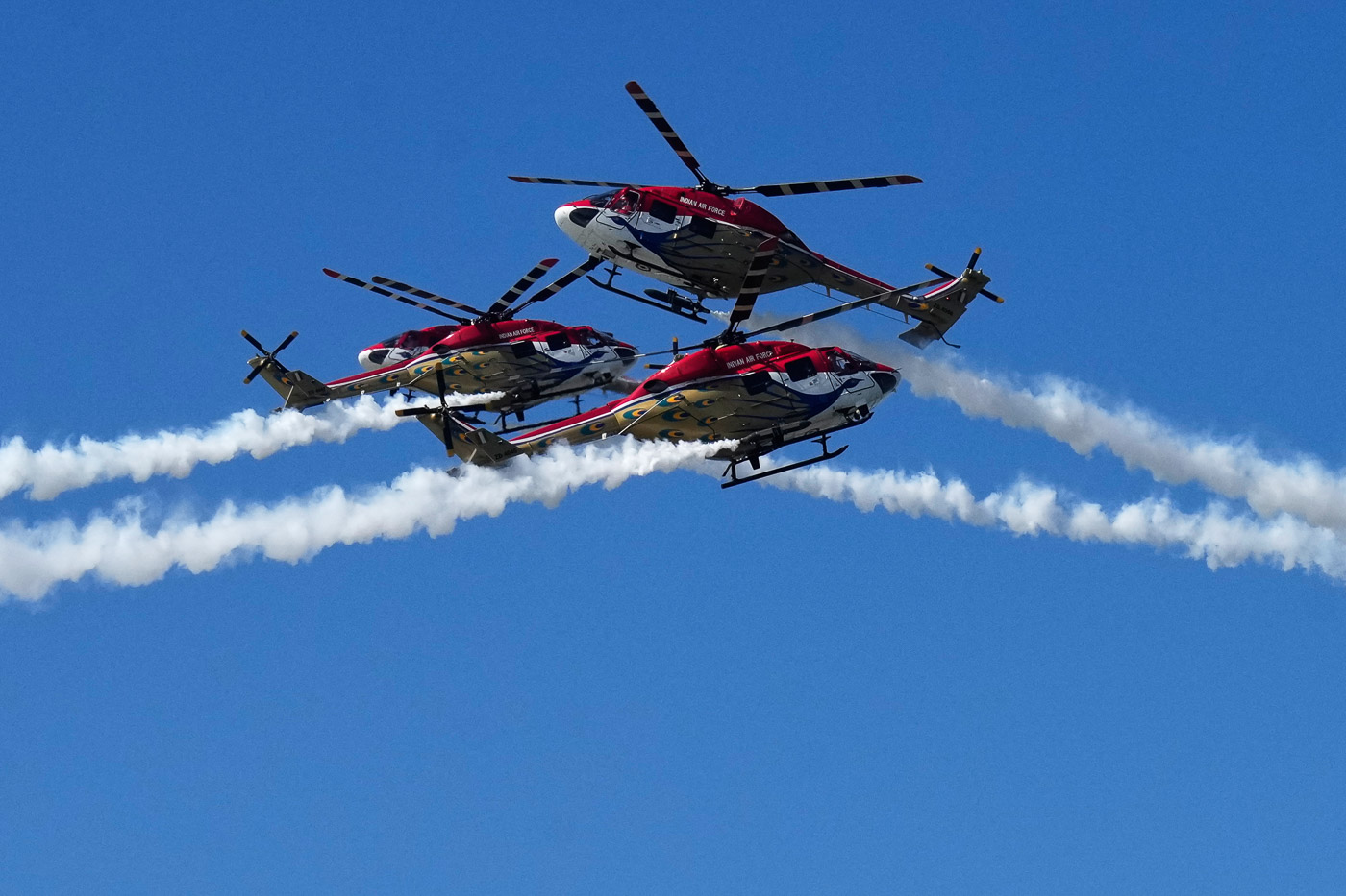 Пилотажная группа «Саранг» выступает во время празднования 93-й годовщины ВВС Индии в Гувахати