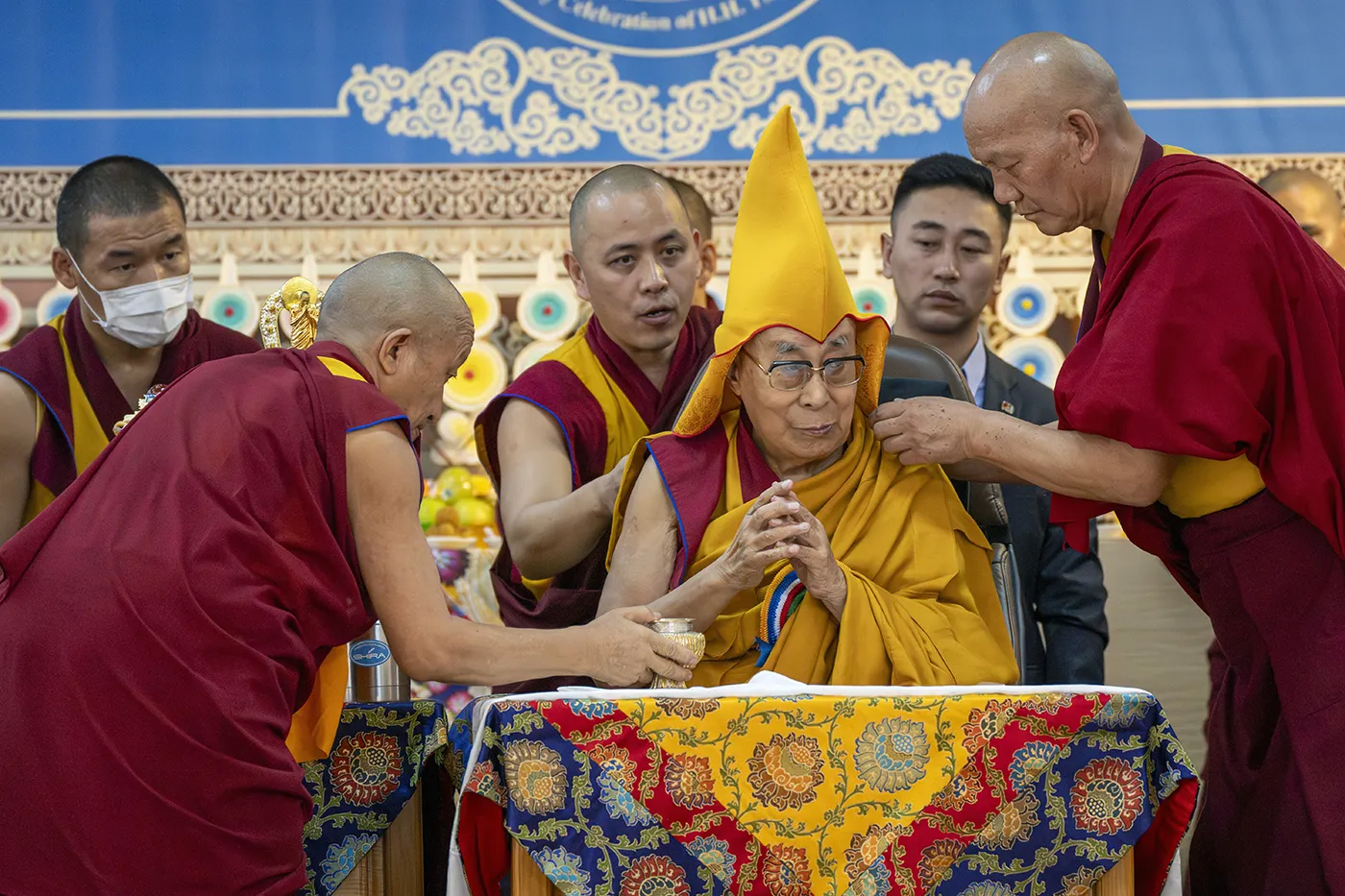 30 июня 2025 года, Дхарамсала, Индия. Монахи помогают духовному лидеру буддистов Далай-ламе XIV надеть церемониальный головной убор во время празднования его 90-летия по тибетскому лунному календарю.