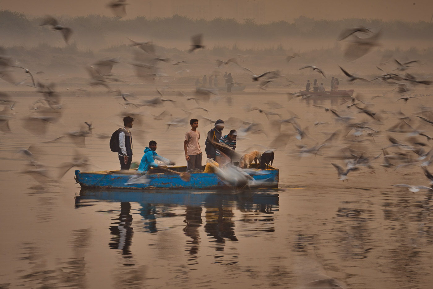 Люди кормят перелётных птиц ранним утром на берегу реки Ямуна в Нью-Дели, Индия